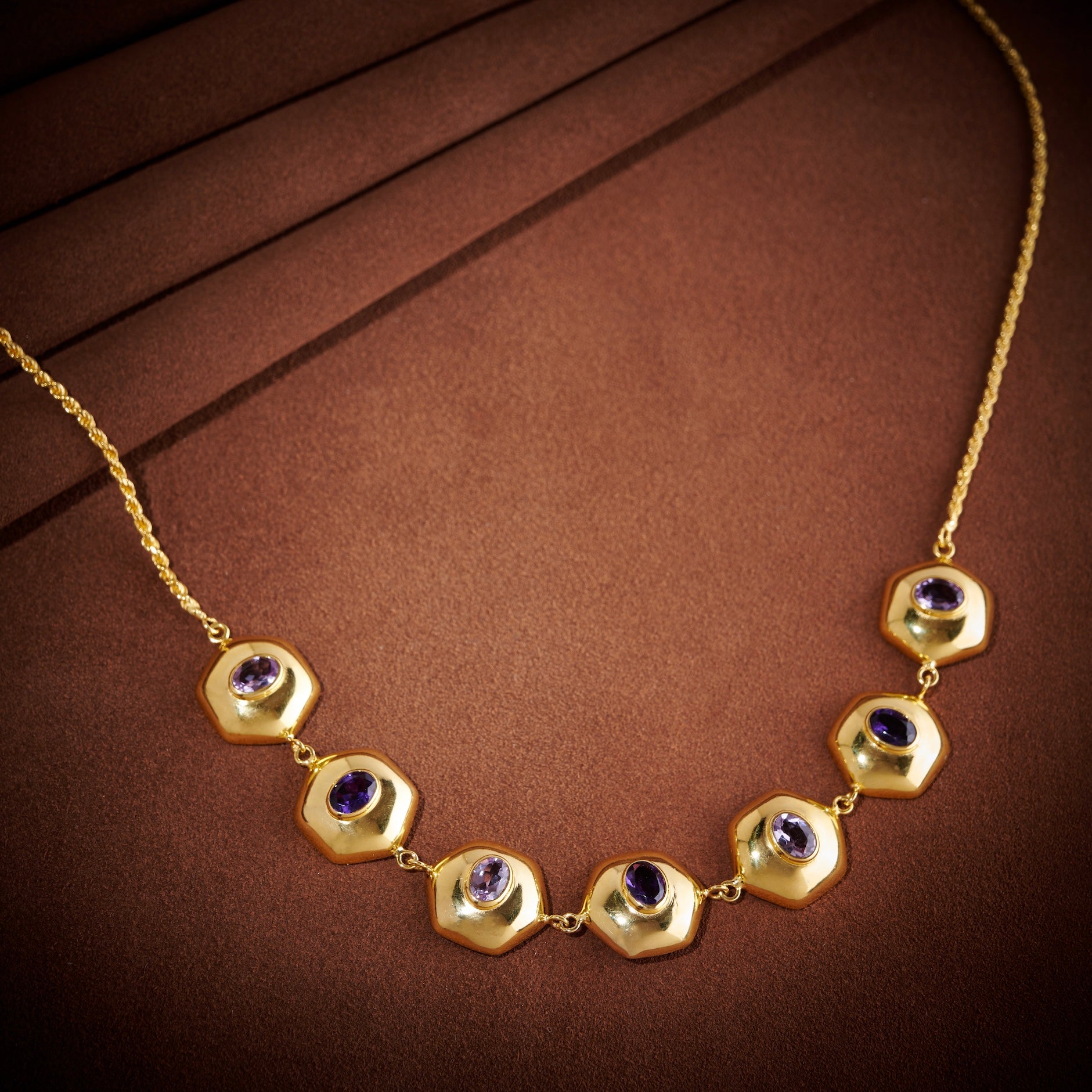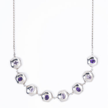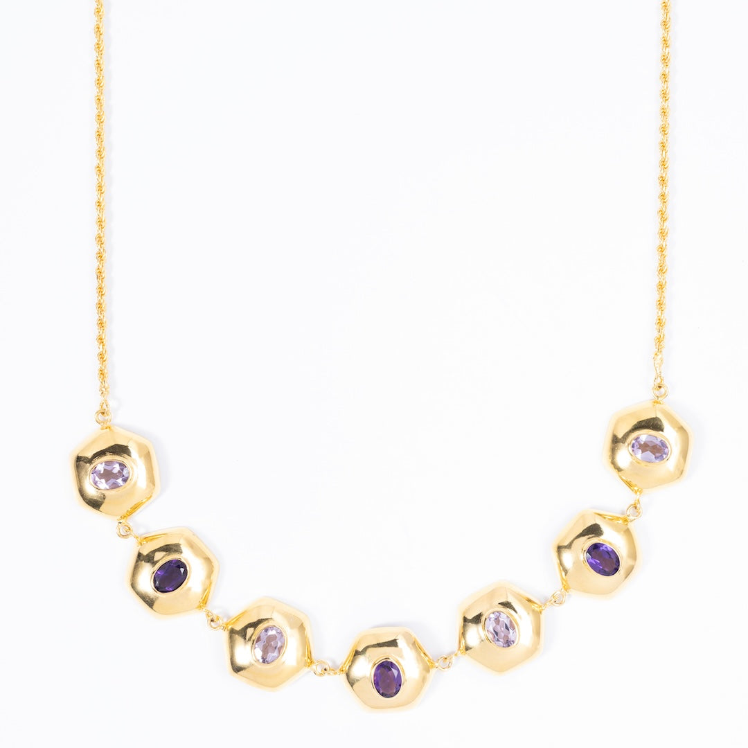 This choker features seven softly sculpted forms, each set with alternating light and dark natural Amethyst stones. The contrast creates a subtle gradient effect, adding interest without overpowering your look.