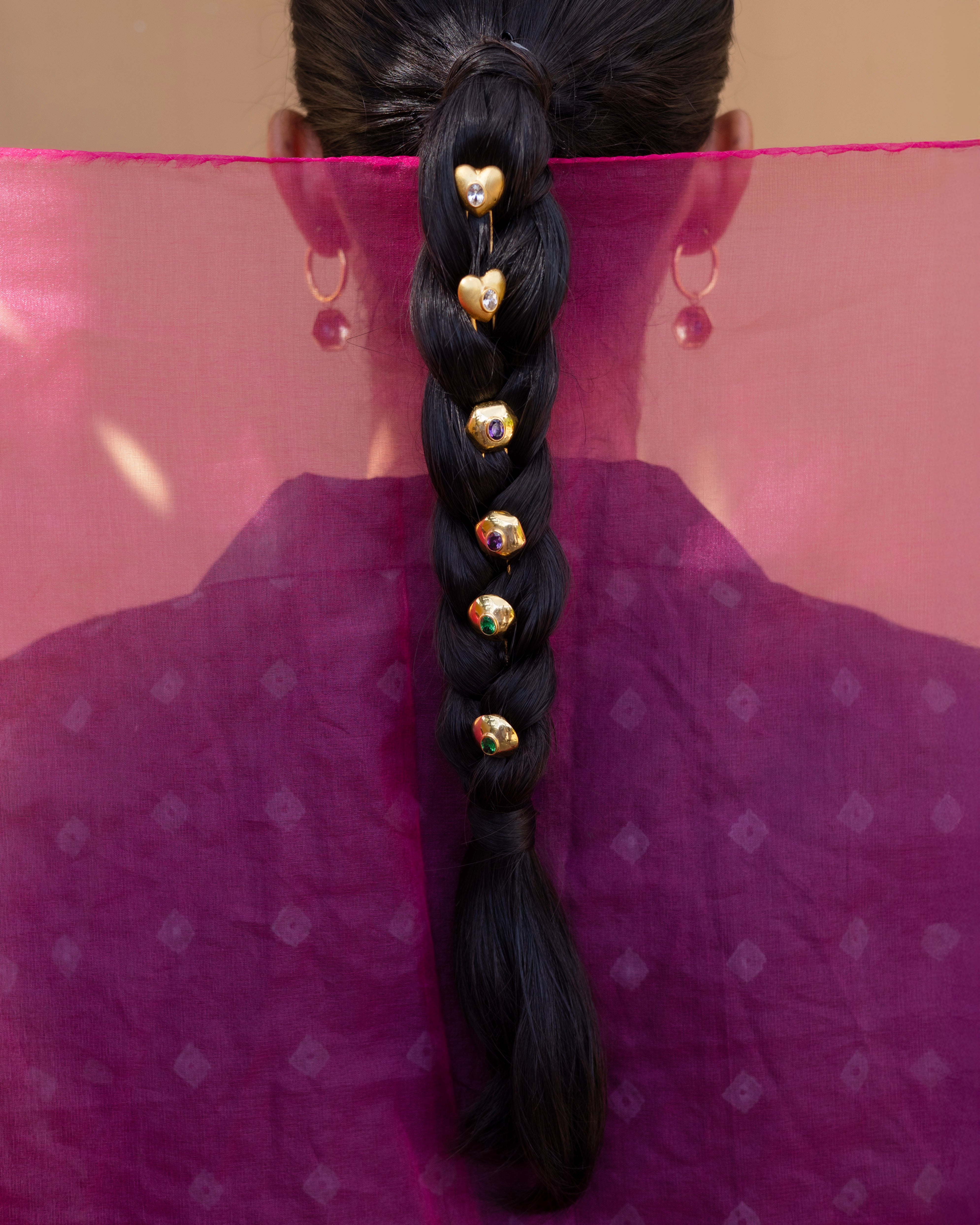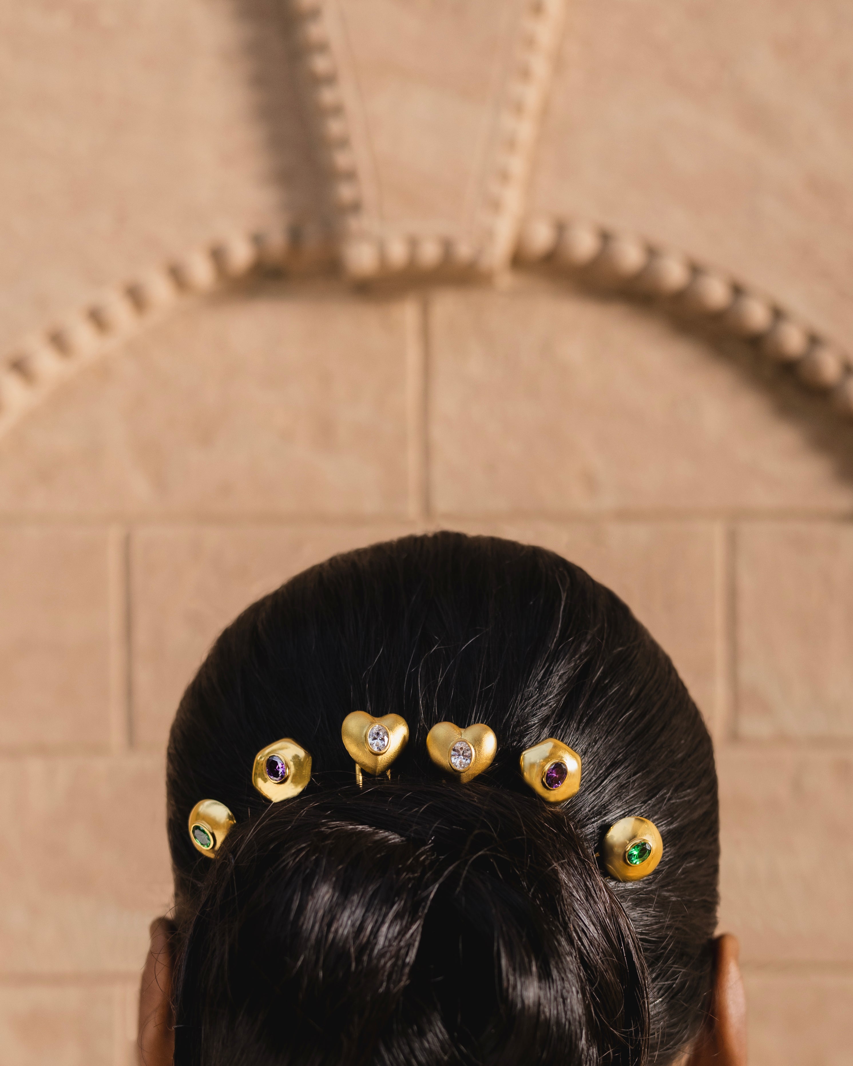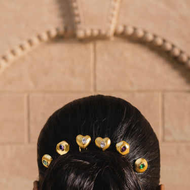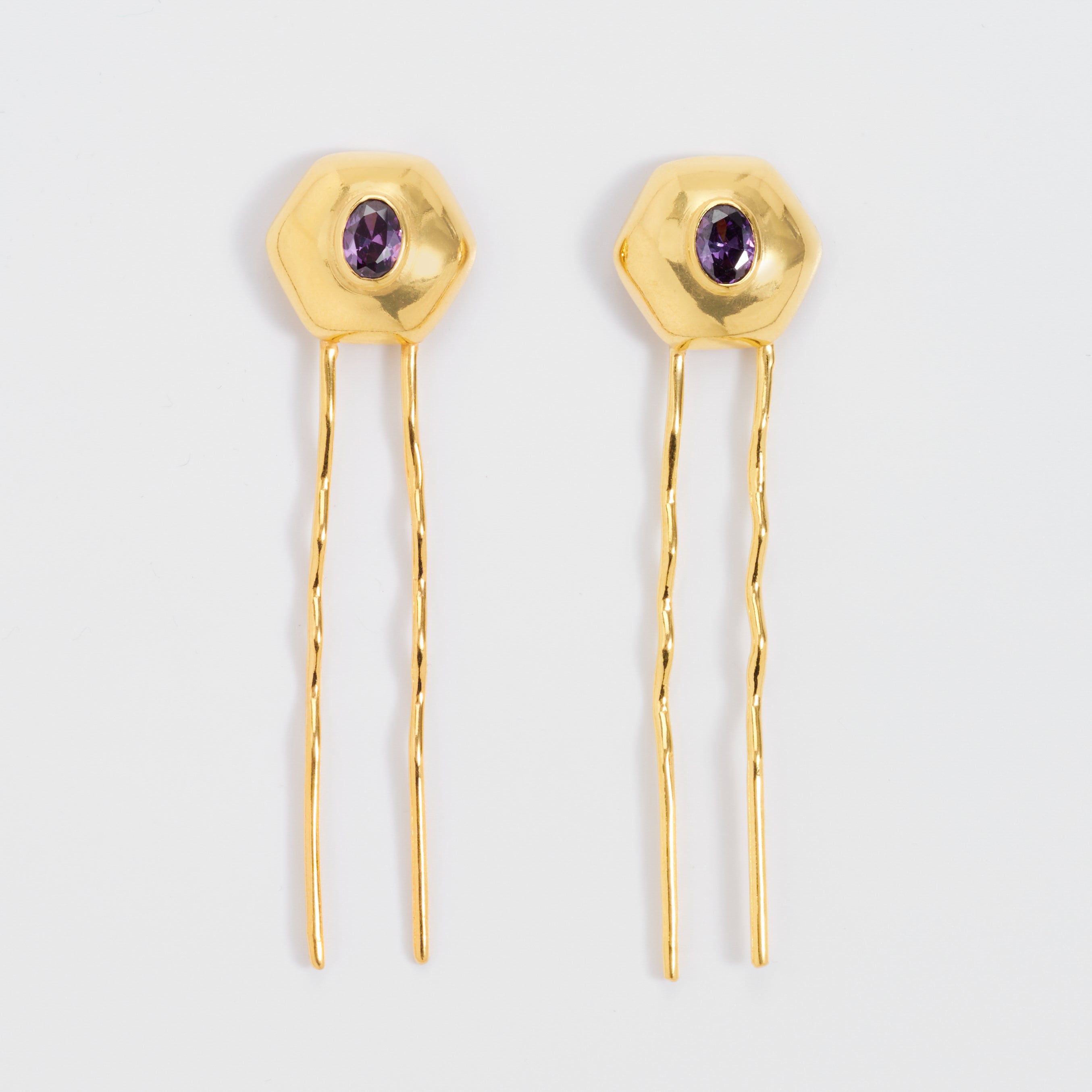 Bold and sculptural, this hexagon hairpin is crafted in 925 sterling silver with a radiant layer of 18K gold plating. The centerpiece, a regal amethyst, brings an air of quiet opulence and timeless elegance. An accessory designed for those who embrace individuality, it elevates hairstyling into a true luxury experience.