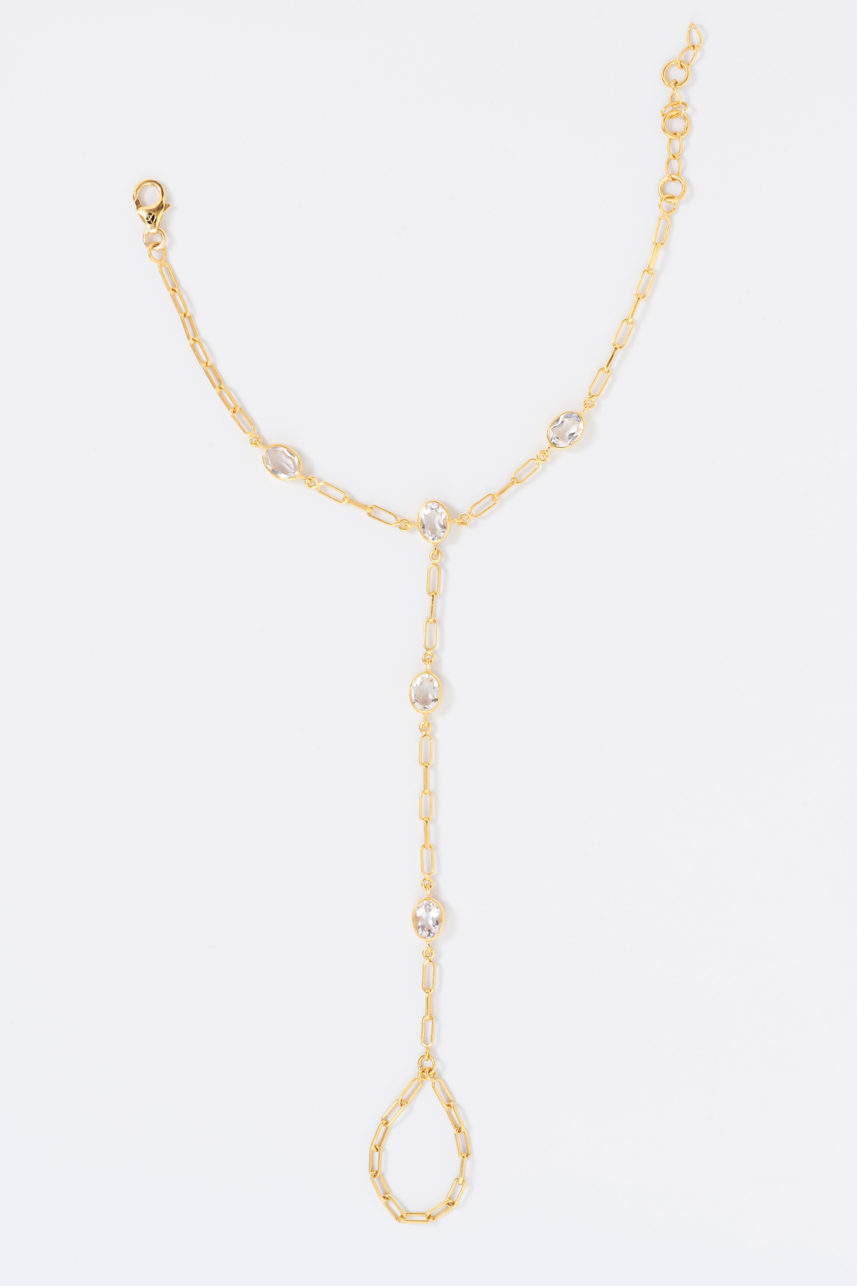 Crafted in sterling silver and rhodium plated, this hand chain bracelet strikes the perfect balance between minimal design and a statement look. Featuring Clear Quartz gemstones, it brings a touch of elegance to any outfit. The delicate chain seamlessly connects the bracelet to a dainty ring, creating a fluid and graceful silhouette. Lightweight yet eye-catching, this piece is perfect for those who love understated elegance with a bold edge.