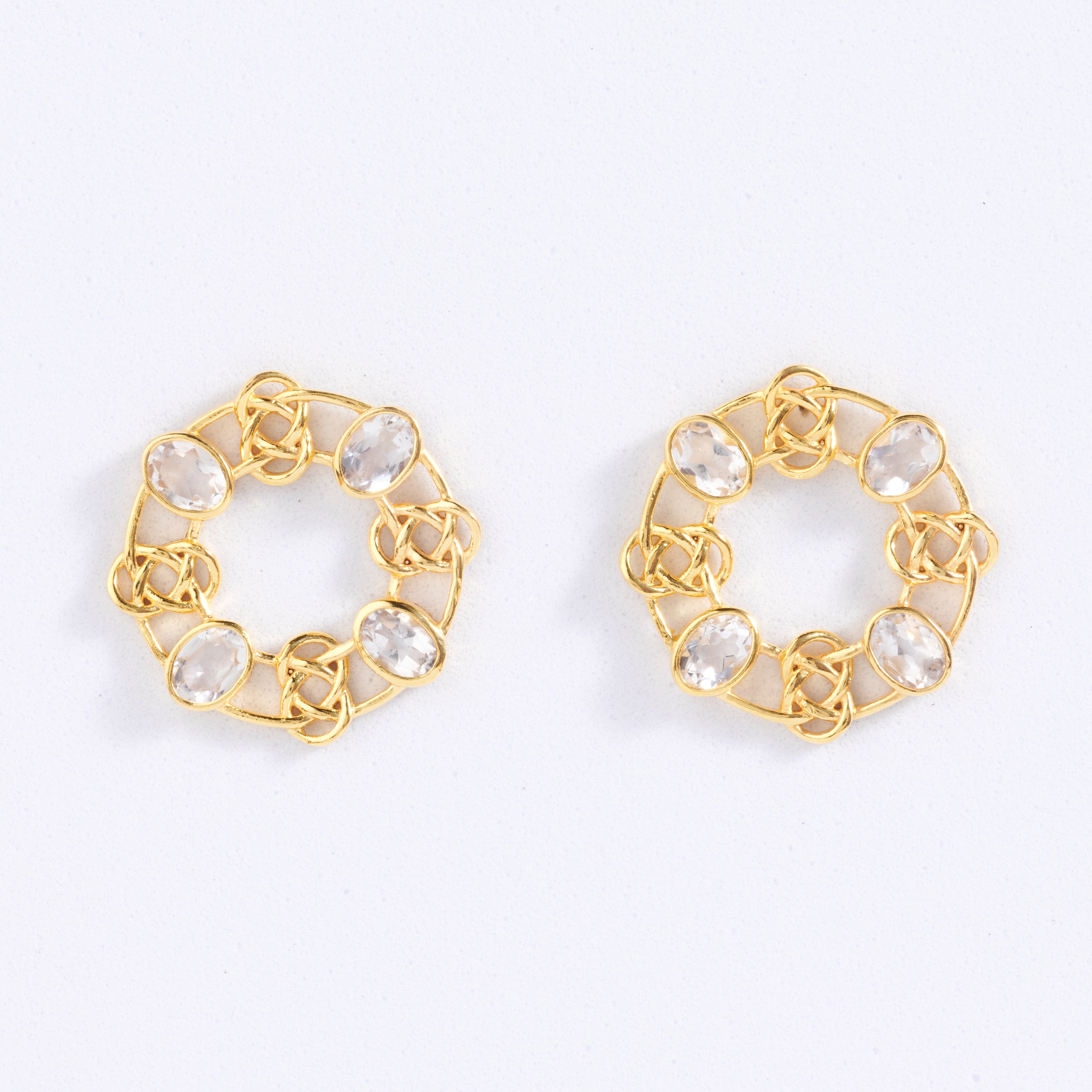 Crafted in 925 sterling silver with an 18K gold finish, these earrings showcase five oval-cut Clear Quartz stones set within a refined lattice design. Celebrated as a stone of clarity and amplification, clear quartz lends subtle brilliance while enhancing focus, making these earrings a versatile expression of modern elegance.