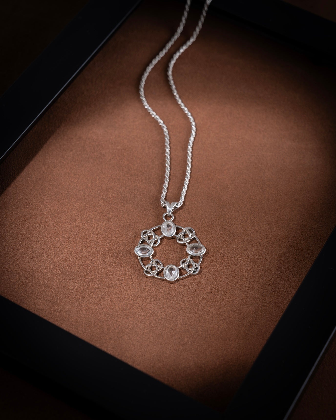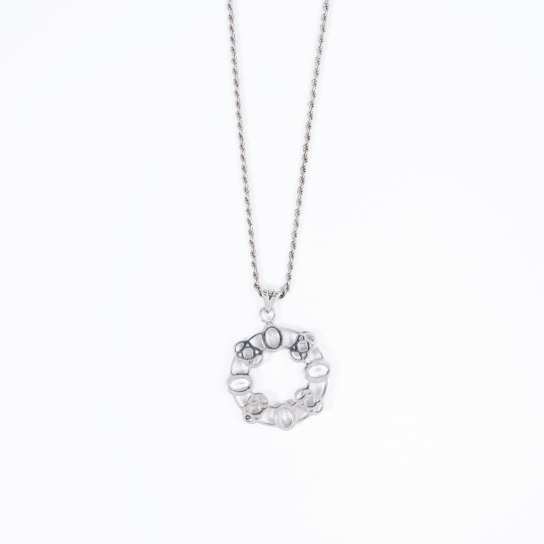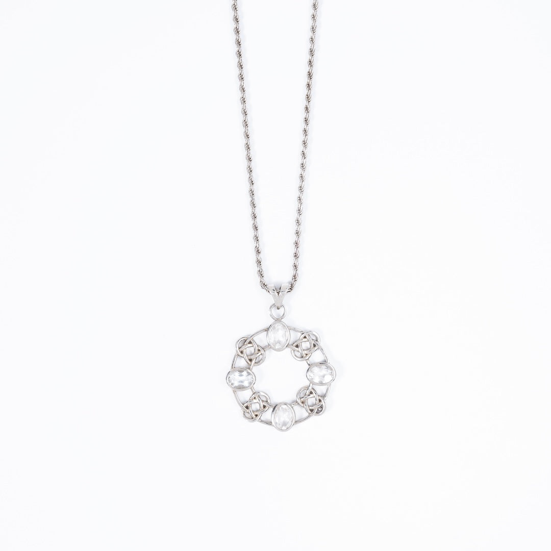 This intricate medallion necklace is crafted in 925 sterling silver with a radiant rhodium finish. It features five oval-cut Clear Quartz stones, each delicately set within a lattice-inspired design. Known as the “master healer,” Clear Quartz is believed to amplify energy and restore balance, bringing a sense of calm focus to your everyday look. A meaningful blend of elegance and energy, this necklace is as versatile as it is timeless.