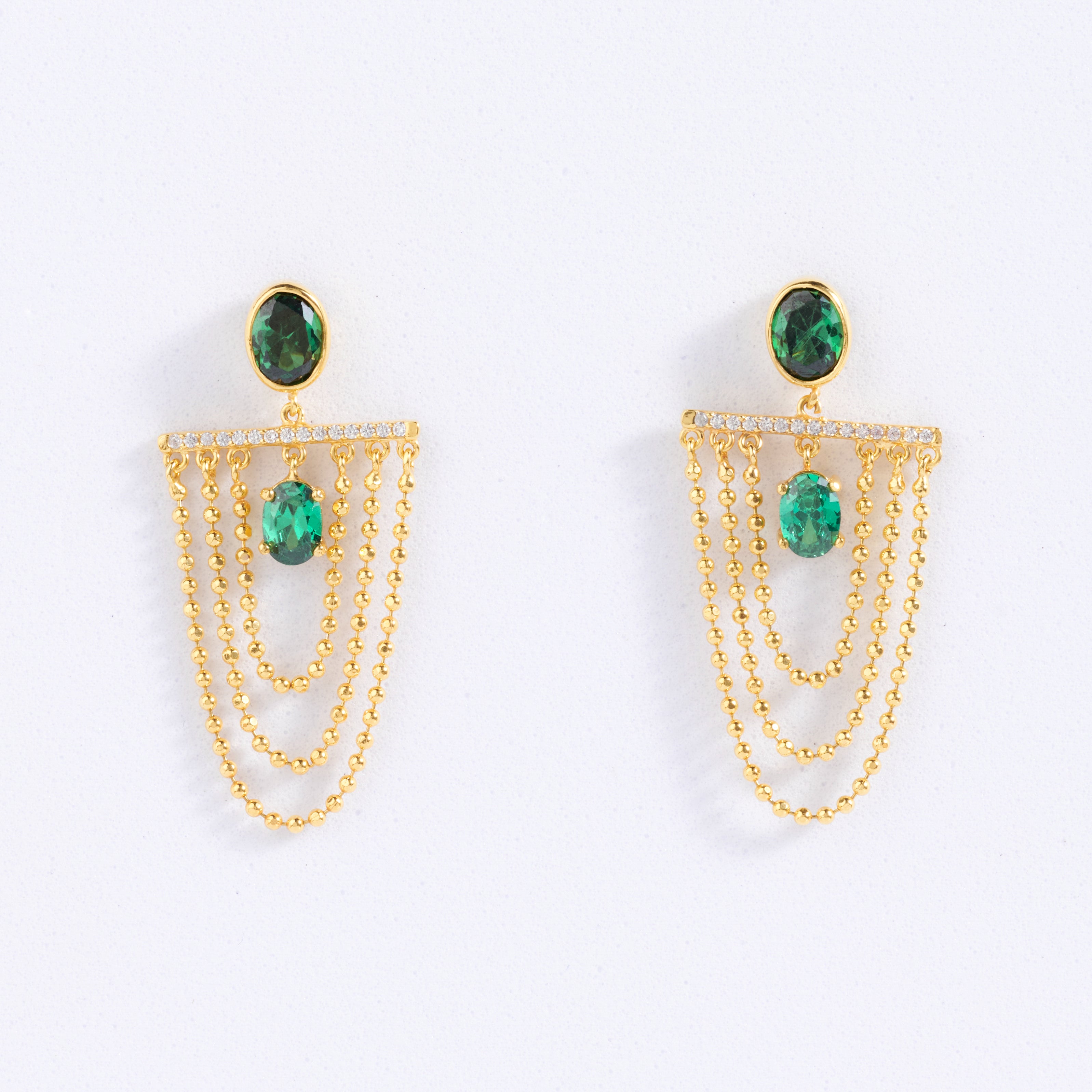 These earrings are crafted in 925 sterling silver and finished with 18K gold plating. The design features green CZ stones in bezel settings, paired with a CZ-studded bar that suspends three cascading gold chains. The result is a graceful play of light and movement, perfect for adding a modern, elevated touch to any look.