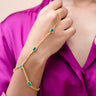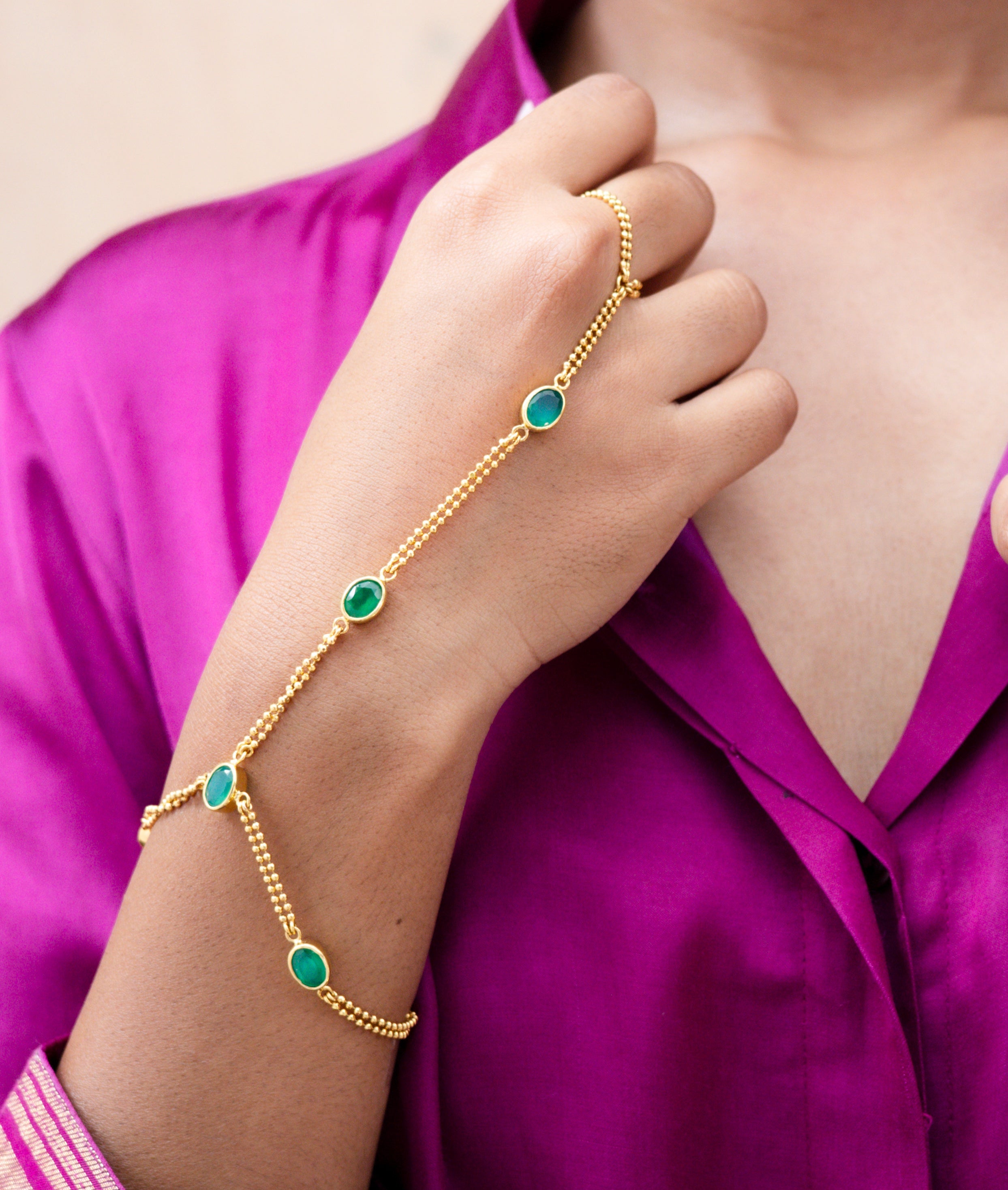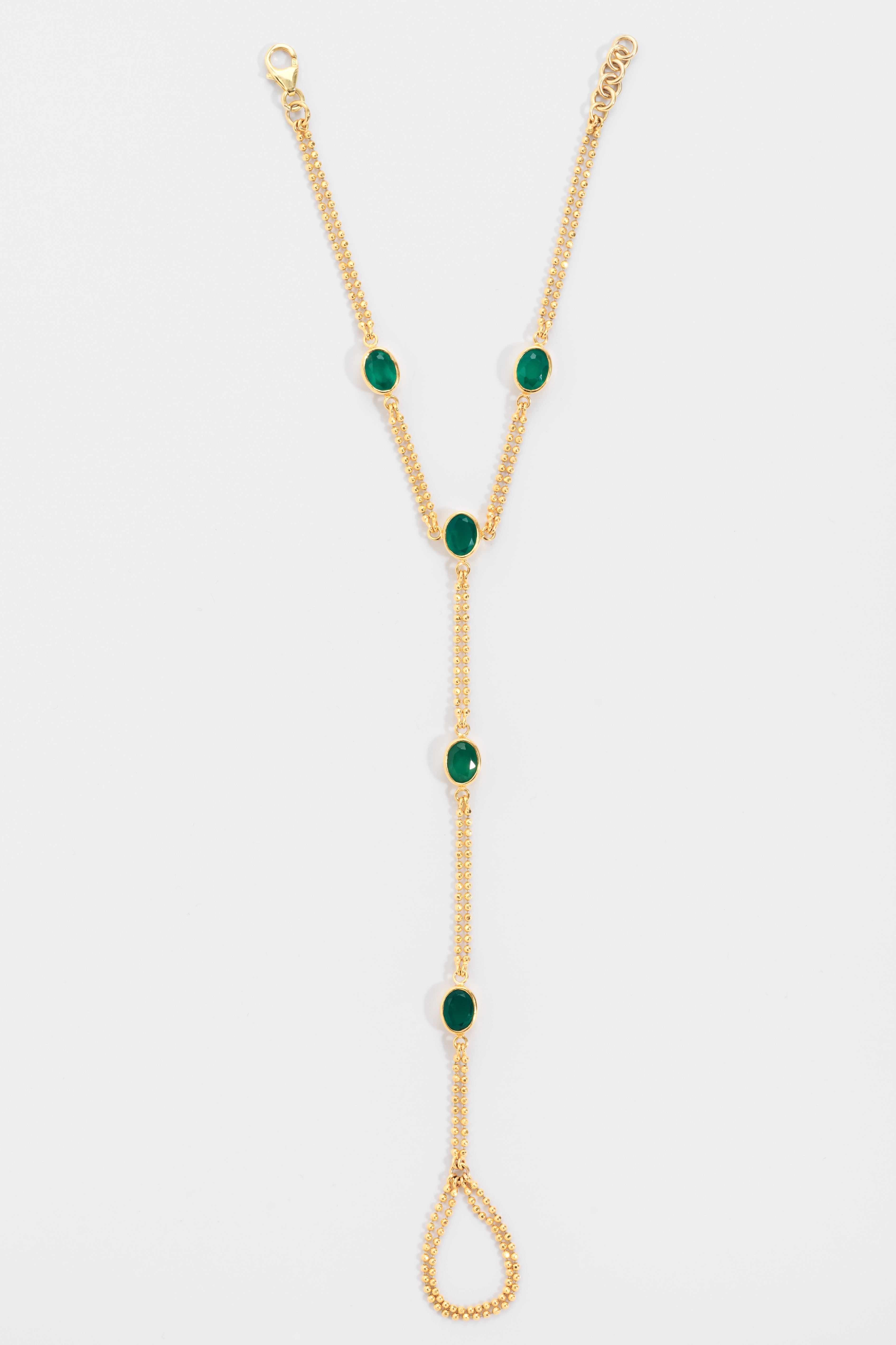 Crafted in sterling silver and plated with 18K gold, this hand chain bracelet strikes the perfect balance between minimal design and a statement look. Featuring Green onyx gemstones, it brings a touch of elegance to any look. The delicate gold-plated chain seamlessly connects the bracelet to a dainty ring, creating a fluid and graceful silhouette. Lightweight yet eye-catching, this piece is perfect for those who love understated elegance with a bold edge.