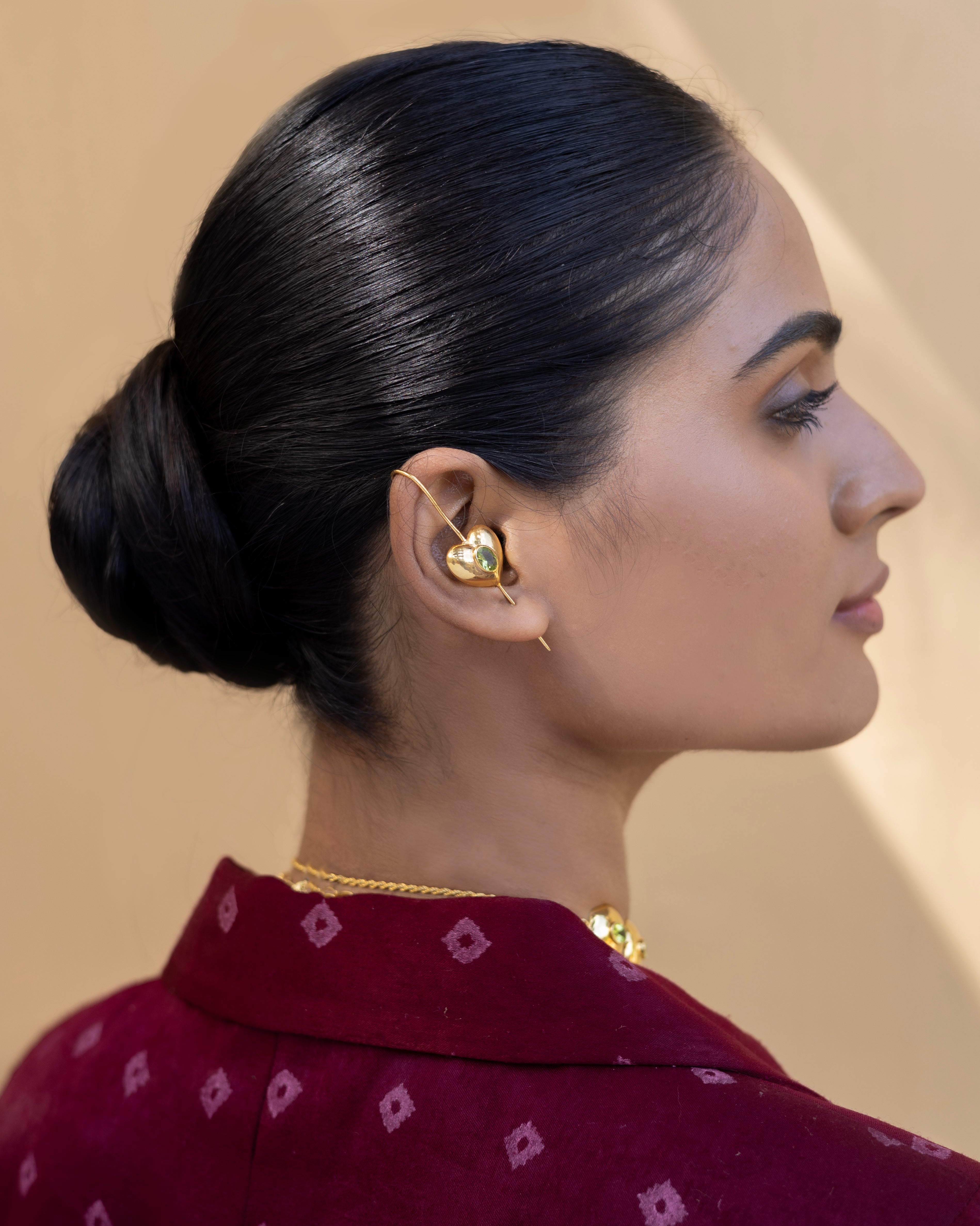 Handcrafted in 925 sterling silver with 18K gold plating, this heart-shaped ear cuff features a radiant peridot at its center. Symbolizing renewal and positivity, the vibrant green stone adds a refreshing glow, while the heart silhouette lends a playful yet refined elegance.Perfect to wear solo for subtle charm or style alongside other earrings for a layered, statement look.
