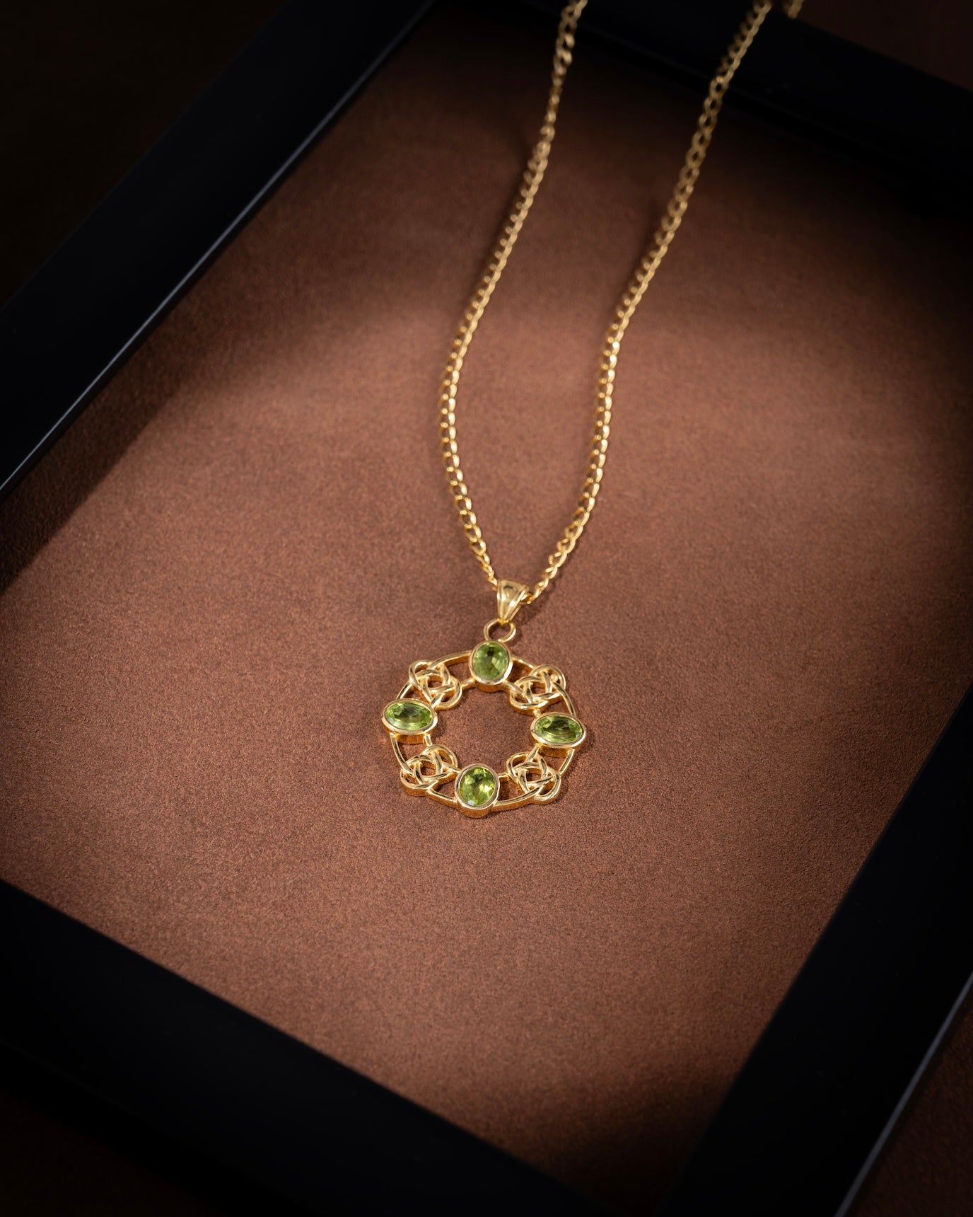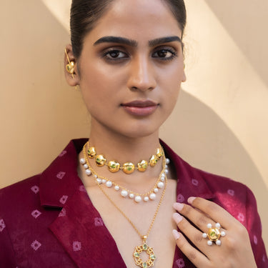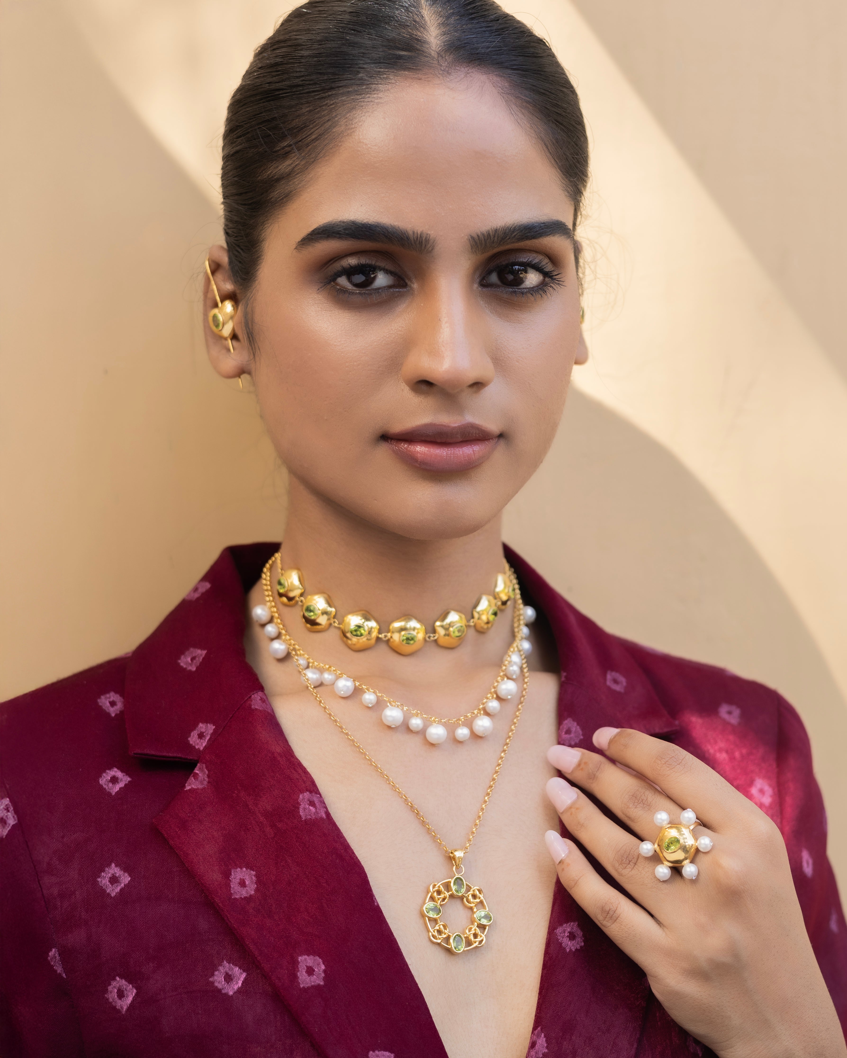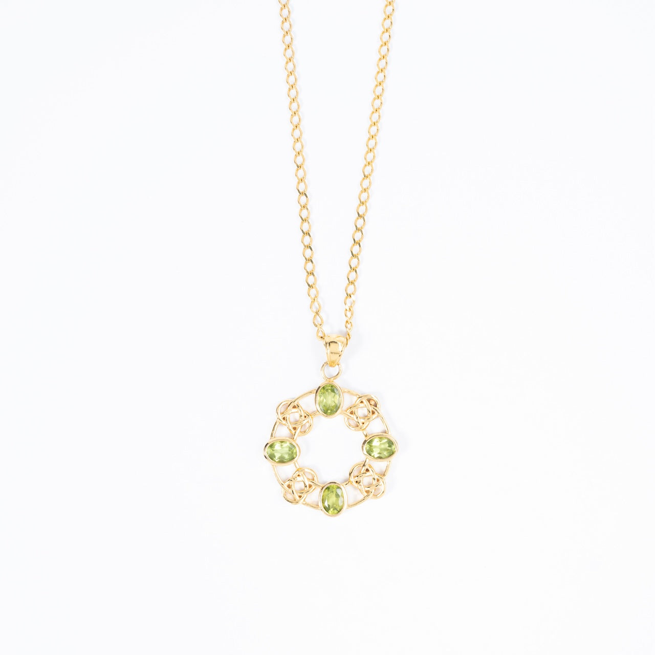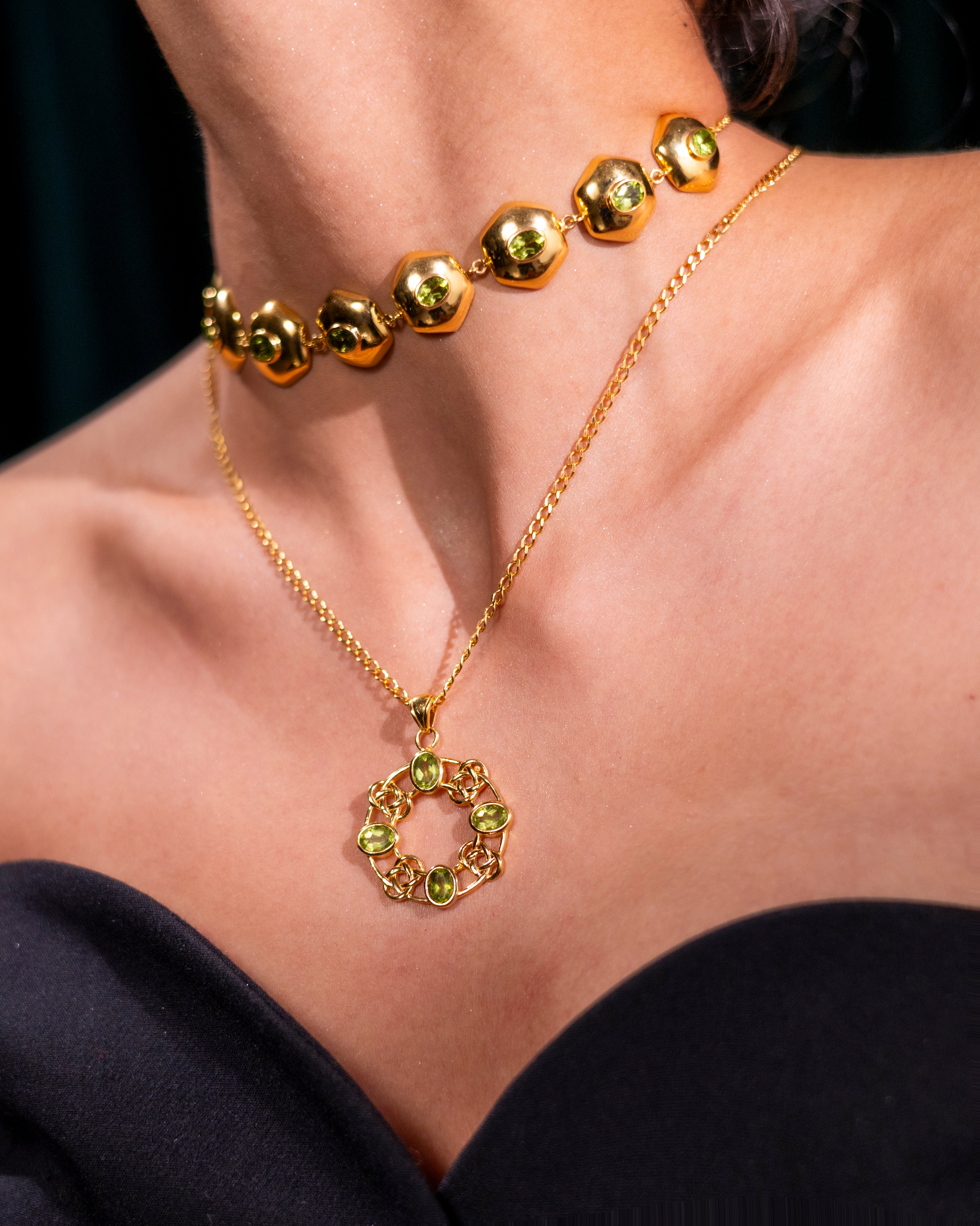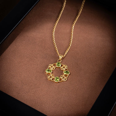 Fresh, vibrant, and full of life. Set in a warm gold-plated lattice, five luminous Peridot stones come together in a balanced circular form—symbolizing renewal, growth, and positivity. A striking yet wearable piece to lift your mood and look.