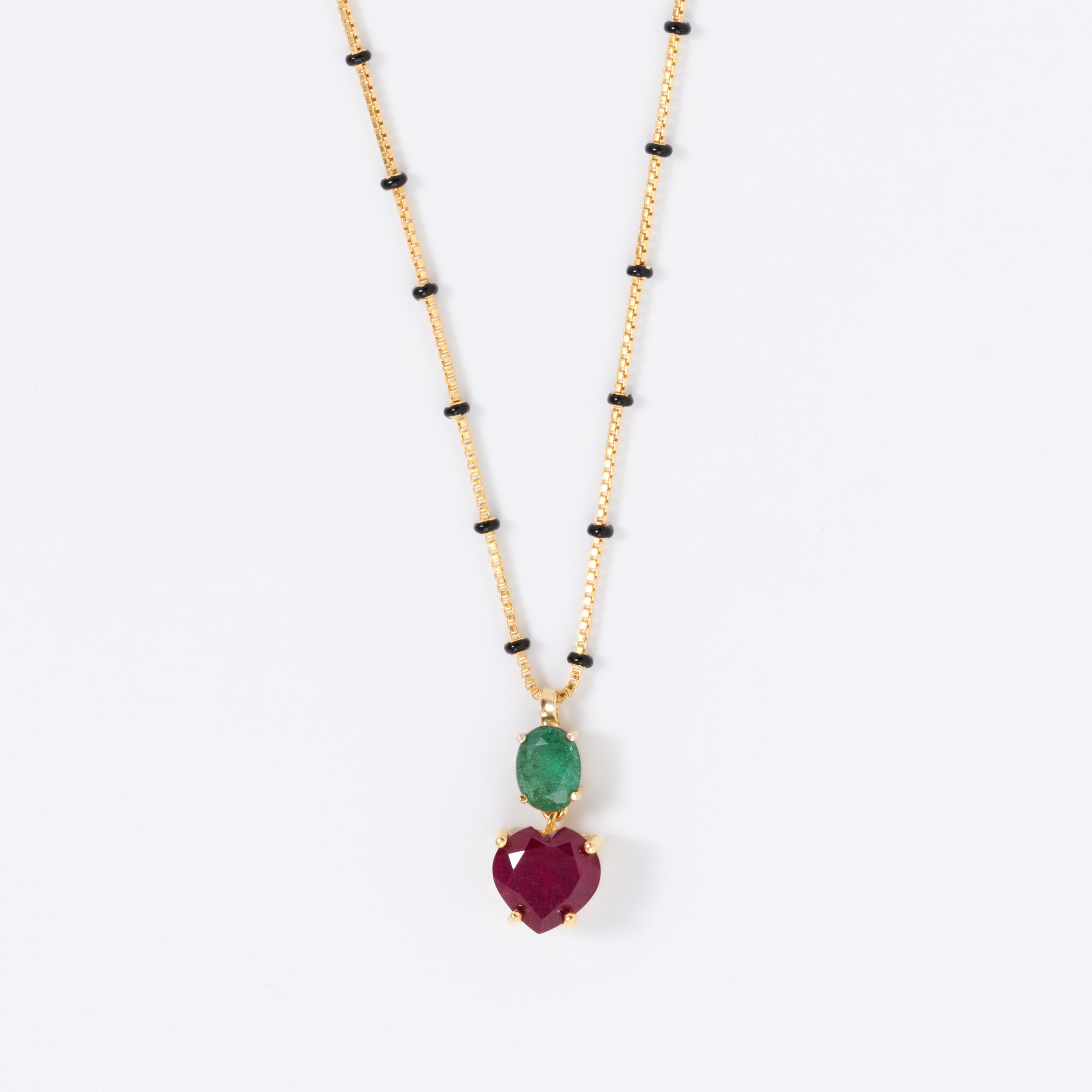 Handcrafted in 925 sterling silver with an 18K gold finish, this limited-edition necklace brings together timeless elegance with a contemporary edge. The delicate chain is enhanced with black enameling, creating a striking contrast against the gold. At its center, a heart-shaped Ruby radiates love and passion, paired with a vivid Emerald that embodies balance and strength.