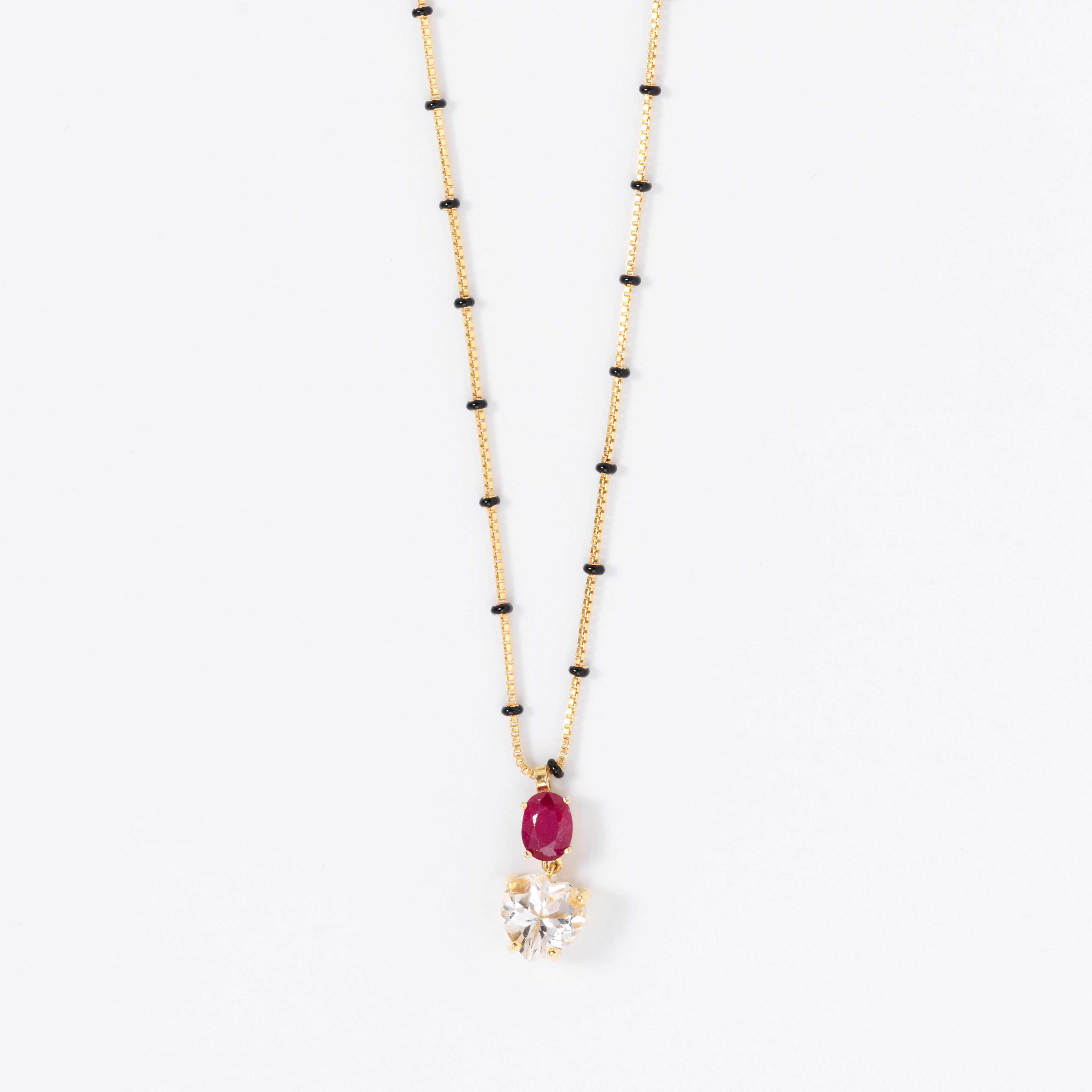 A limited-edition piece crafted in 925 sterling silver with an 18K gold finish, designed with a perfect balance of elegance and modernity. The chain is accented with black enameling, creating a refined contrast against the gold. The centerpiece features a heart-shaped White Topaz, symbolizing clarity and truth, crowned with a brilliant Ruby, the stone of love and vitality.