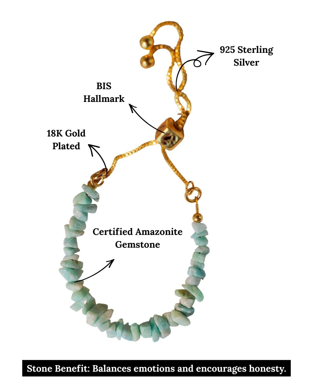 Elevate your elegance with our exquisite bolo-style bracelet, featuring genuine Amazonite chips set in sterling silver with a luxurious 18K gold plating for lasting beauty. This versatile bracelet is designed with an innovative sliding clasp mechanism, allowing for easy adjustment to achieve the perfect fit on any wrist. Whether you're dressing up for a special occasion or adding a touch of sophistication to your everyday look, this captivating Amazonite bracelet is the perfect accessory to enhance your style and radiate confidence.