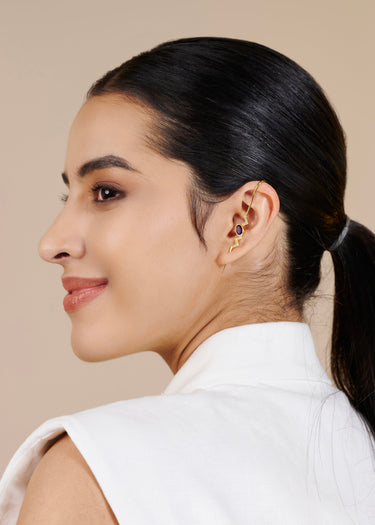 Make a statement with this sterling silver ear cuff, plated in 18k Gold/Rhodium. Featuring a bold zigzag design with a vibrant oval-cut Amethyst and delicate CZ accents, it’s finished with a sleek pointed tip for a modern, edgy look. Lightweight and stylish, perfect for solo wear or stacking.