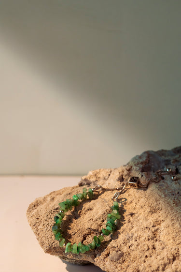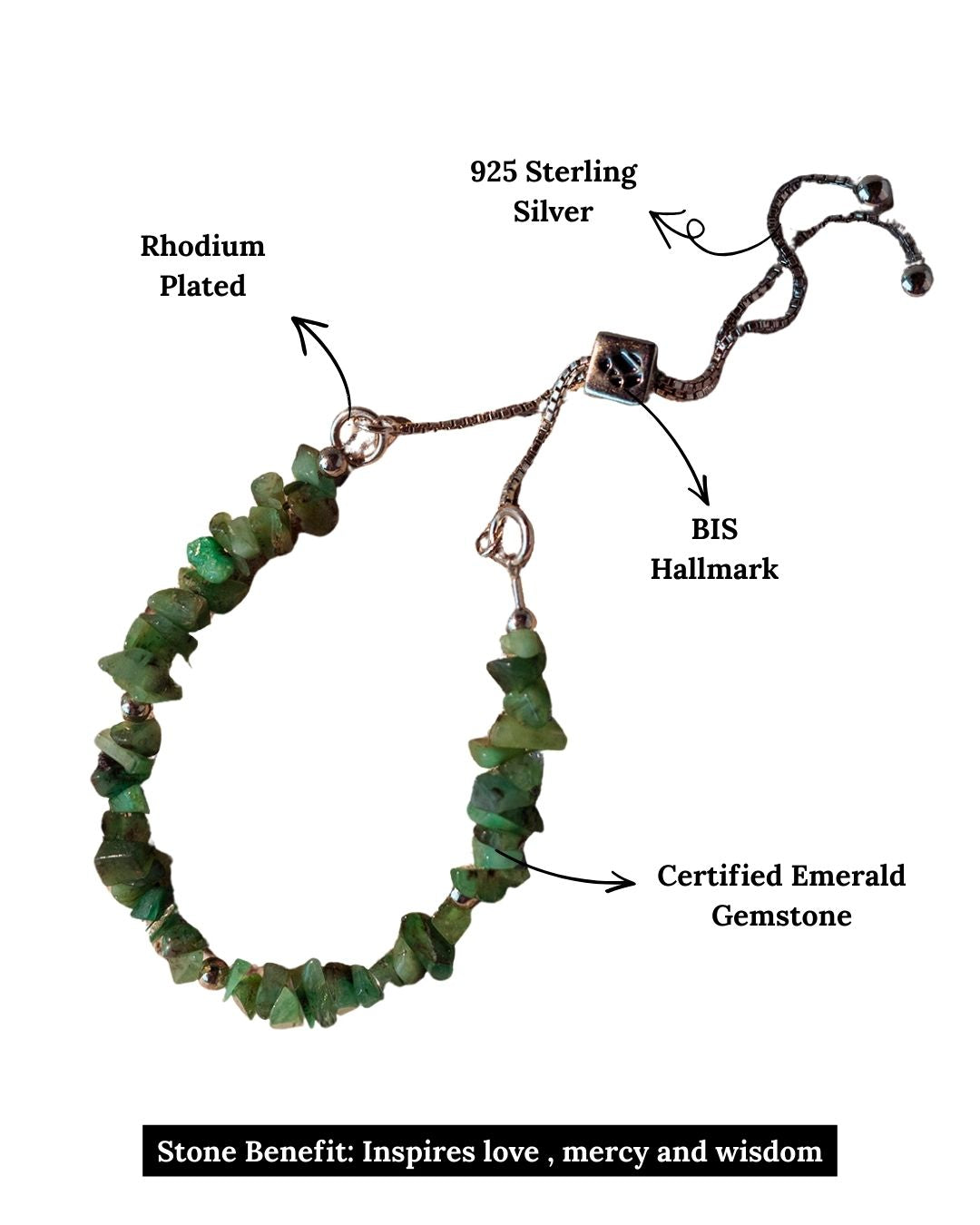 Elevate your elegance with our exquisite bolo-style bracelet, showcasing genuine Emerald chips interspersed with small metal ball accents as chic spacers. Crafted in sterling silver with rhodium plating for lasting beauty, this bracelet exudes sophistication. Its versatile design includes an innovative sliding clasp mechanism, allowing for easy adjustment to achieve the perfect fit on any wrist. Whether you're dressing up for a special occasion or adding a touch of refinement to your everyday look, this captivating Emerald bracelet is the perfect accessory to enhance your style and radiate confidence.