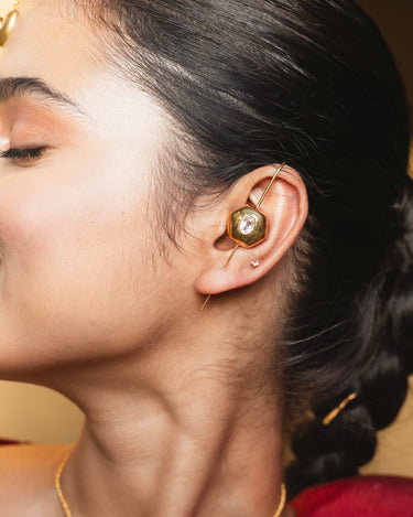 These earcuff feature hexagon-inspired gold forms set with clear quartz stones that reflect light with a soft, natural glow. Crafted in 925 sterling silver and plated with 18K gold, they embody quiet sophistication — minimal, fluid, and endlessly versatile.