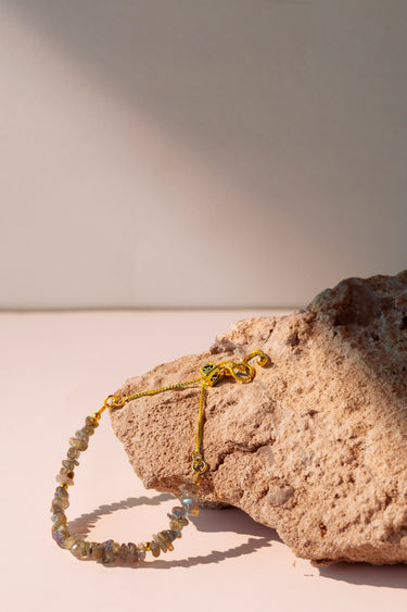 Elevate your elegance with our exquisite bolo-style bracelet, showcasing genuine Labradorite chips interspersed with small metal ball accents as chic spacers. Crafted in sterling silver with a luxurious 18K gold plating for lasting beauty, this bracelet exudes sophistication. Its versatile design includes an innovative sliding clasp mechanism, allowing for easy adjustment to achieve the perfect fit on any wrist. Whether you're dressing up for a special occasion or adding a touch of refinement to your everyday look, this captivating Labradorite bracelet is the perfect accessory to enhance your style and radiate confidence.