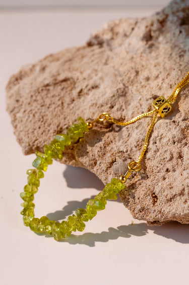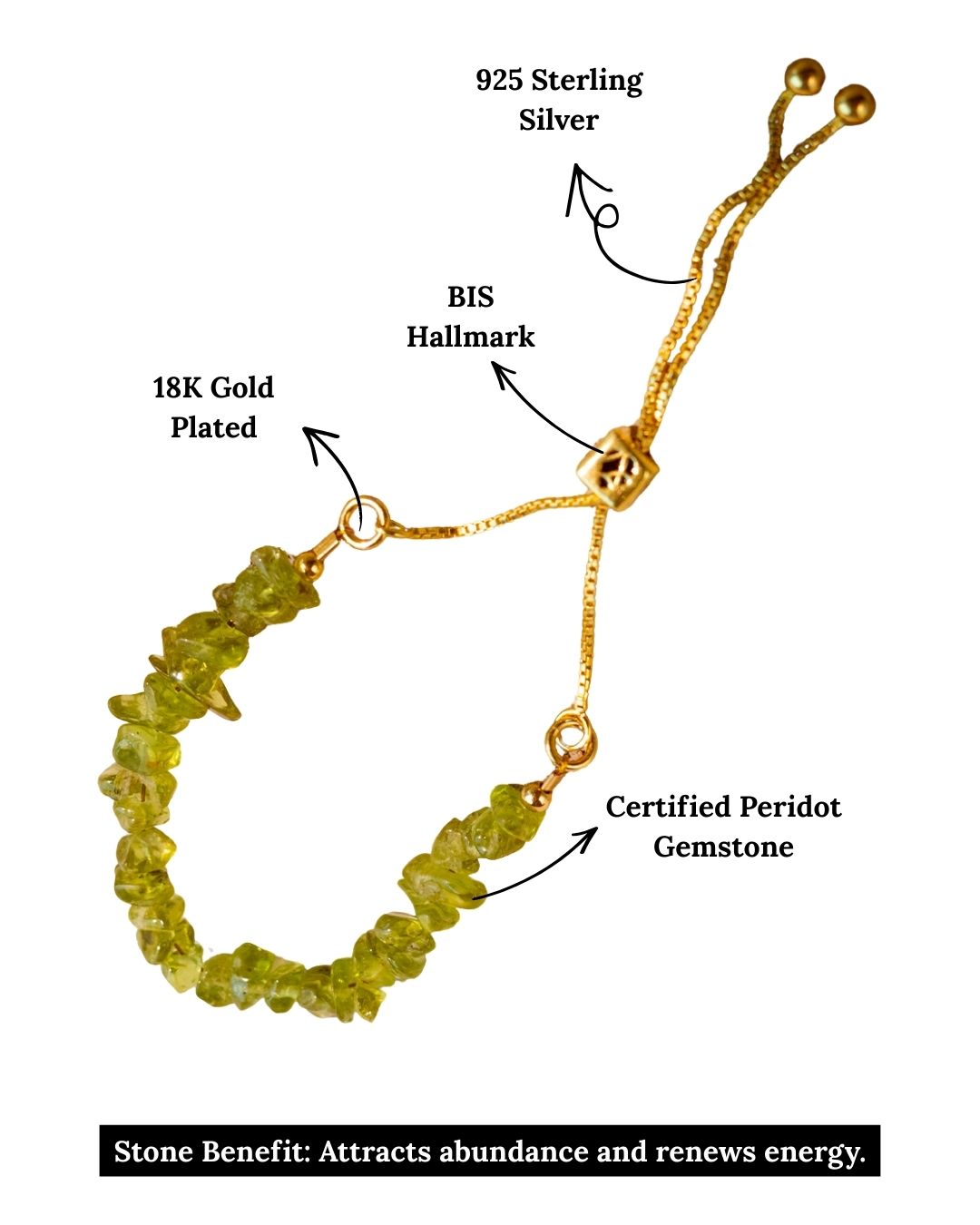 Elevate your elegance with our exquisite bolo-style bracelet, featuring genuine Peridot chips set in sterling silver with a luxurious 18K gold plating for lasting beauty. This versatile bracelet is designed with an innovative sliding clasp mechanism, allowing for easy adjustment to achieve the perfect fit on any wrist. Whether you're dressing up for a special occasion or adding a touch of sophistication to your everyday look, this captivating Peridot bracelet is the perfect accessory to enhance your style and radiate confidence.