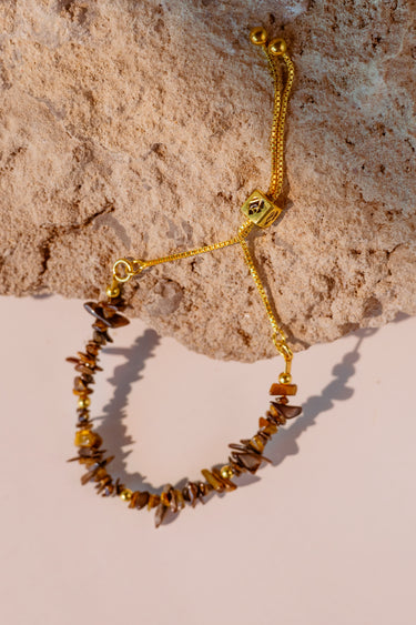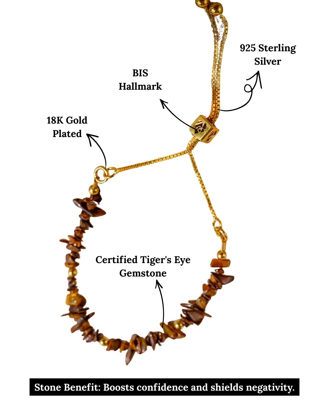 Enhance your elegance with our stunning bolo-style bracelet, featuring genuine Tiger's Eye chips accented by small metal ball spacers. Crafted in sterling silver with a luxurious 18K gold plating for lasting shine, this bracelet exudes timeless sophistication. The versatile design includes an innovative sliding clasp mechanism, allowing you to easily adjust the fit for any wrist size. Whether you're dressing up for a special occasion or adding a touch of refinement to your everyday ensemble, this captivating Tiger's Eye bracelet is the perfect accessory to elevate your style and exude confidence.
