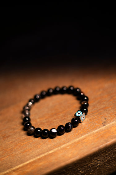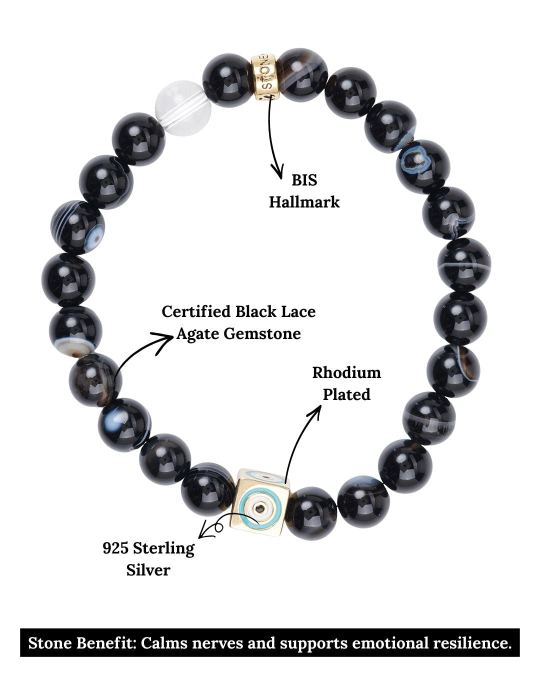 This bracelet features Black Lace Agate gemstones, an engraved Evil Eye charm at the center, symbolizing protection and good fortune, and our signature logo bead, all crafted in 925 Sterling Silver. Strung on a durable stretch cord, it seamlessly blends sophistication with everyday wear, perfect for stacking or wearing solo as a timeless accessory.