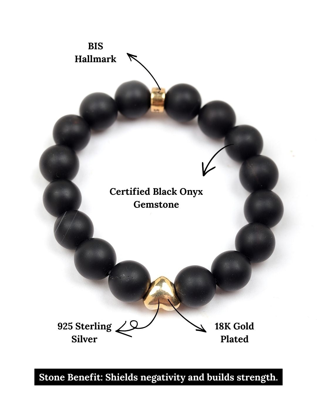A symbol of strength and protection, this Black Onyx bracelet features deep, glossy black hues, accented with heart charm and our signature logo bead, all crafted in 925 Sterling Silver and 18k gold plated for lasting shine. Perfect for stacking or solo, ideal for everyday wear or a meaningful gift.