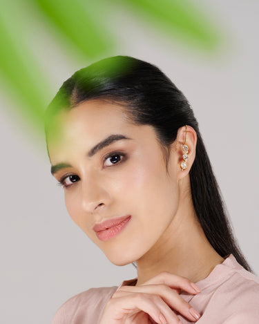Crafted in sterling silver with 18k gold/Rhodium plating, this sleek ear cuff features striking oval-cut Clear Quartz stones and CZ accents. Its bold, sculptural design follows the ear’s curve, finished with a pointed tip for an edgy touch.