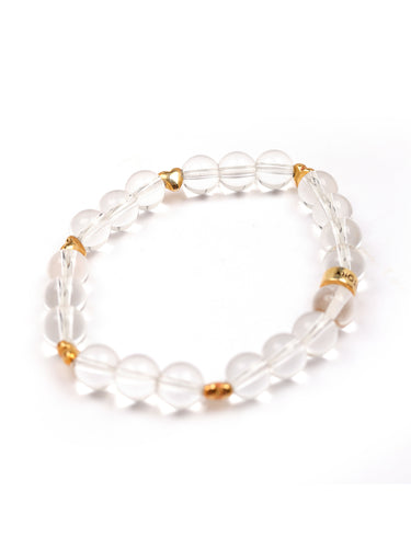 A symbol of clarity and energy, this Clear Quartz bracelet features a luminous, crystal-clear design, accented with heart charms and our signature logo bead, all crafted in 925 Sterling Silver and 18k gold plated for lasting shine. Perfect for stacking or solo, ideal for everyday wear or a meaningful gift.