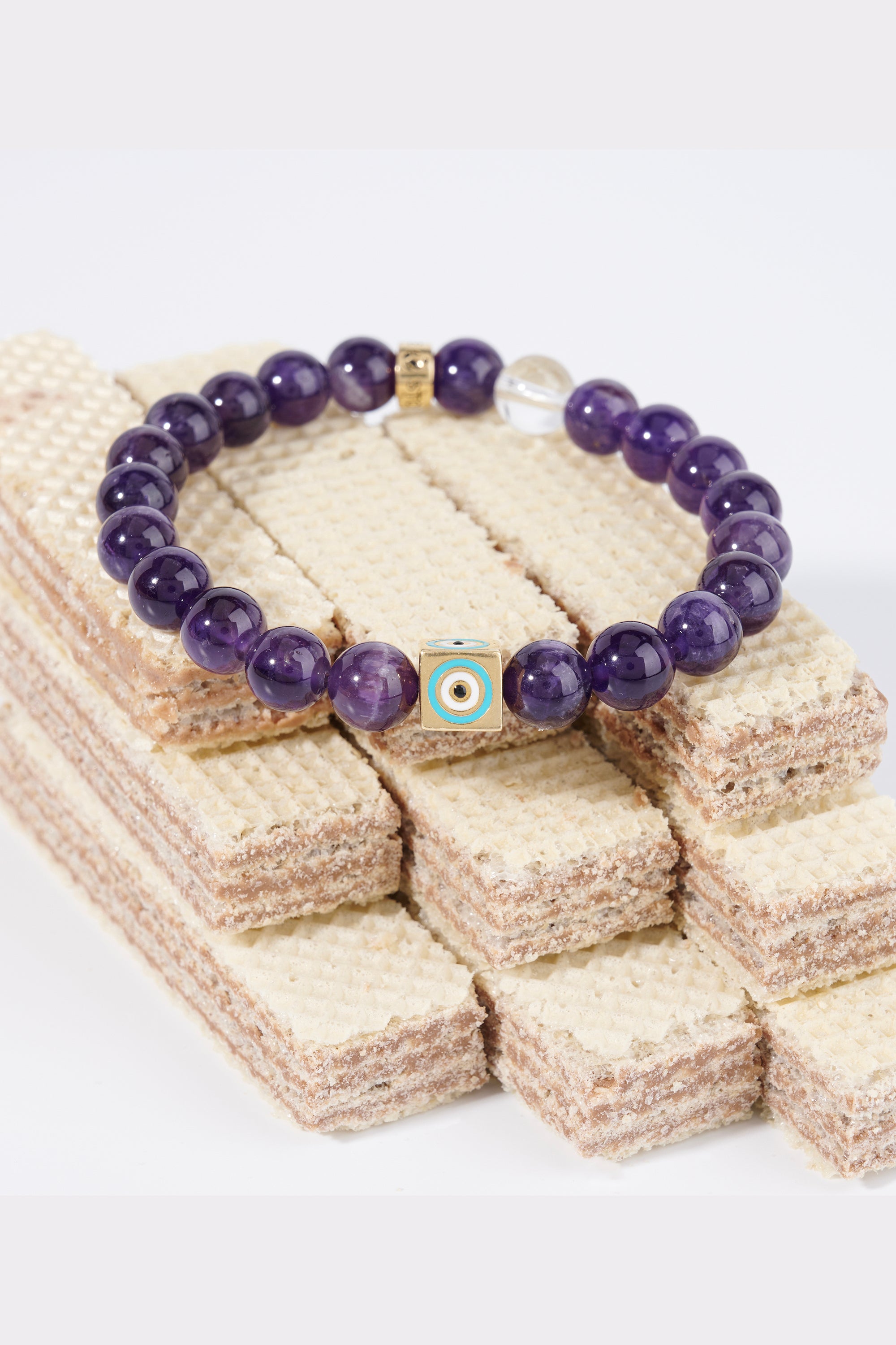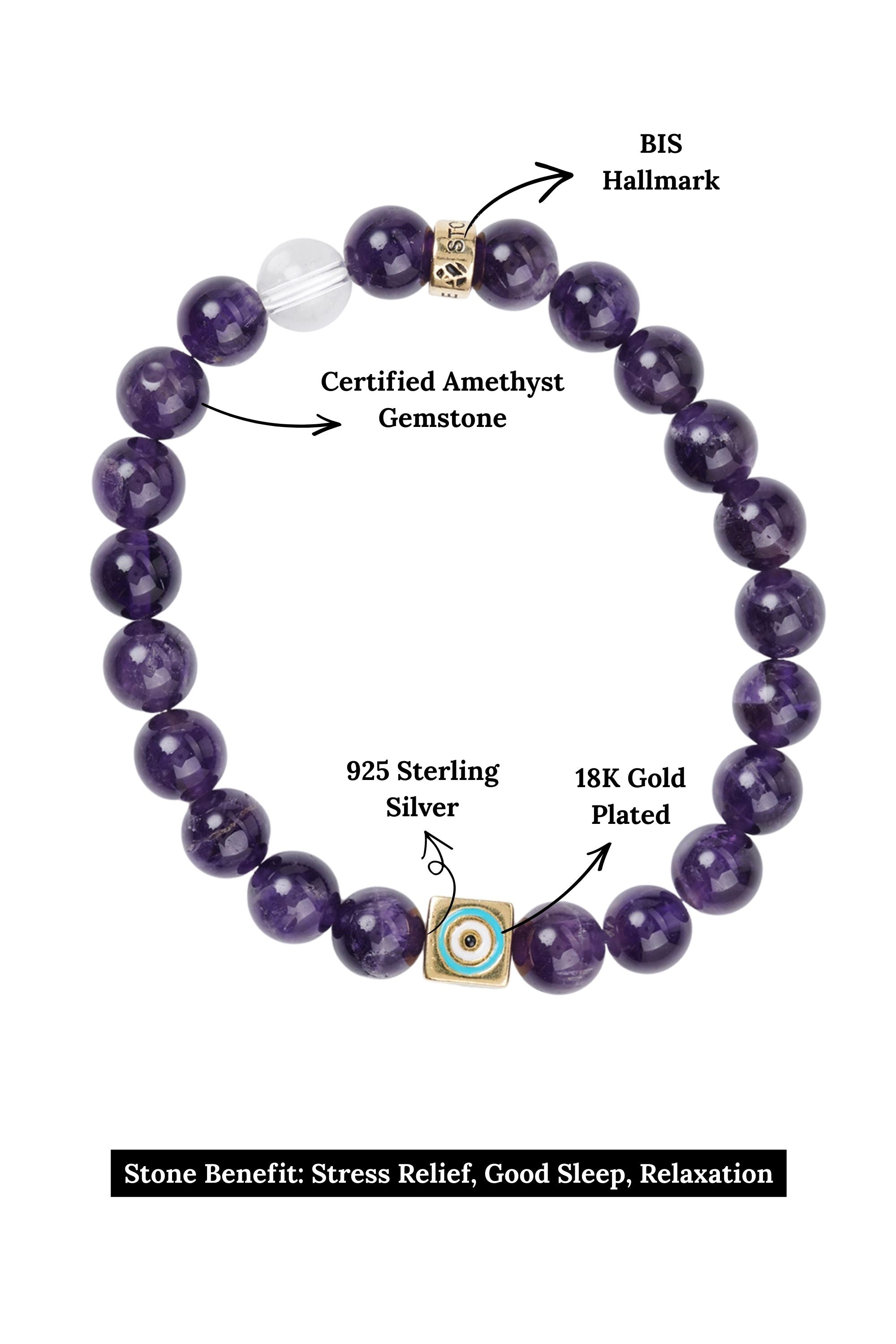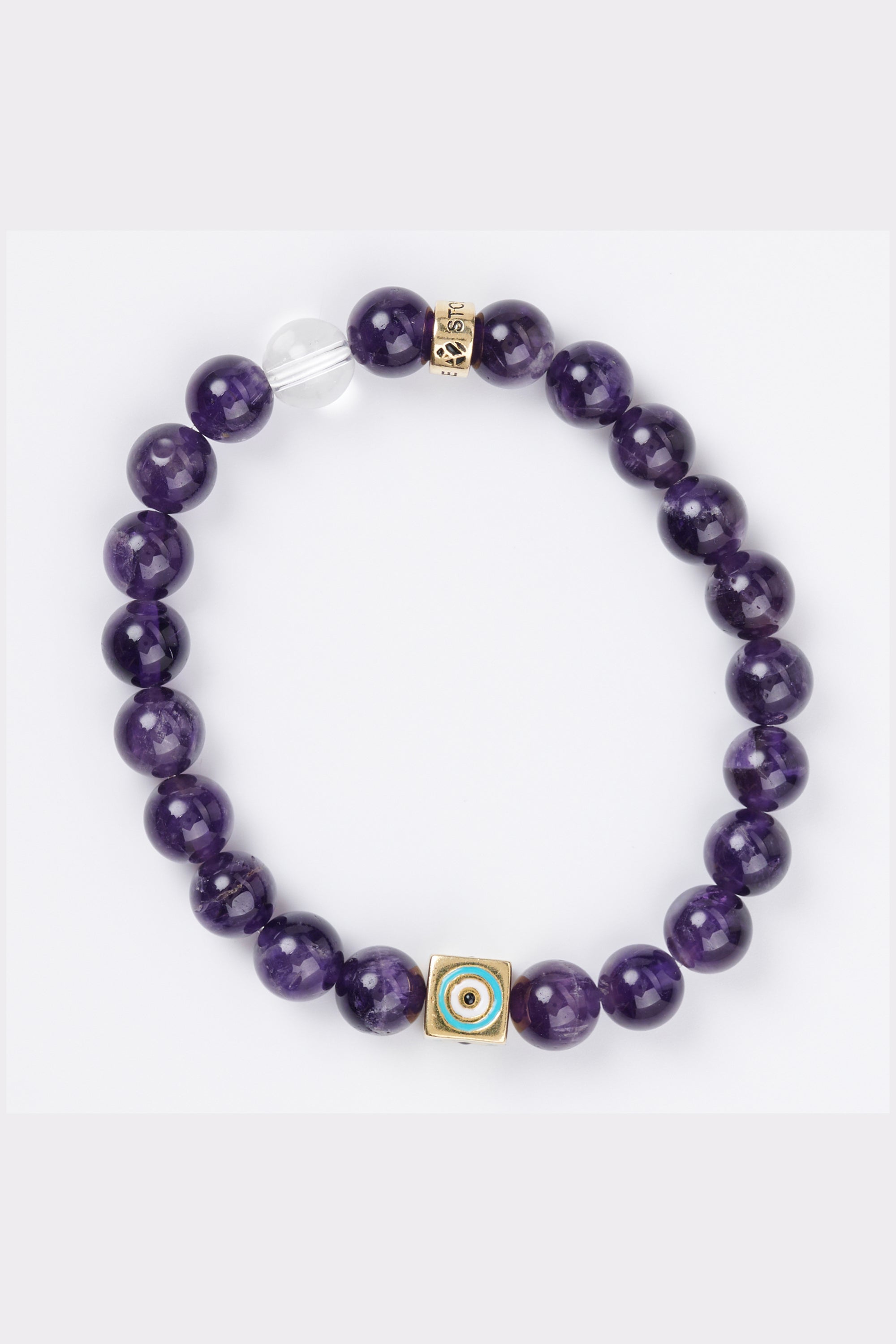 This bracelet features Amethyst gemstones, an engraved Evil Eye charm at the center, symbolizing protection and good fortune, and our signature logo bead, all crafted in 925 Sterling Silver. It seamlessly blends sophistication with everyday wear. Strung on a durable stretch cord, this bracelet is perfect for stacking or wearing solo as a timeless accessory.