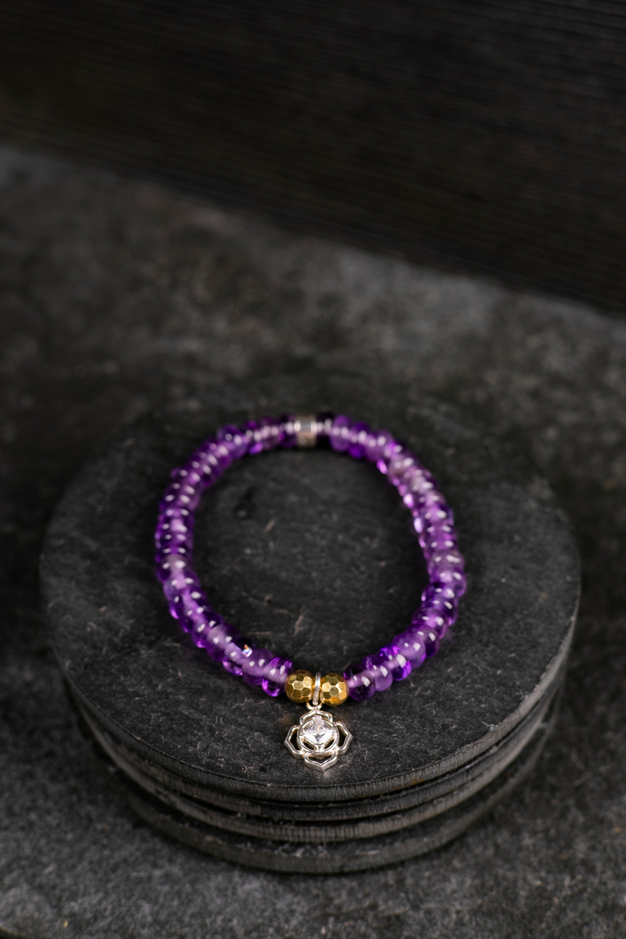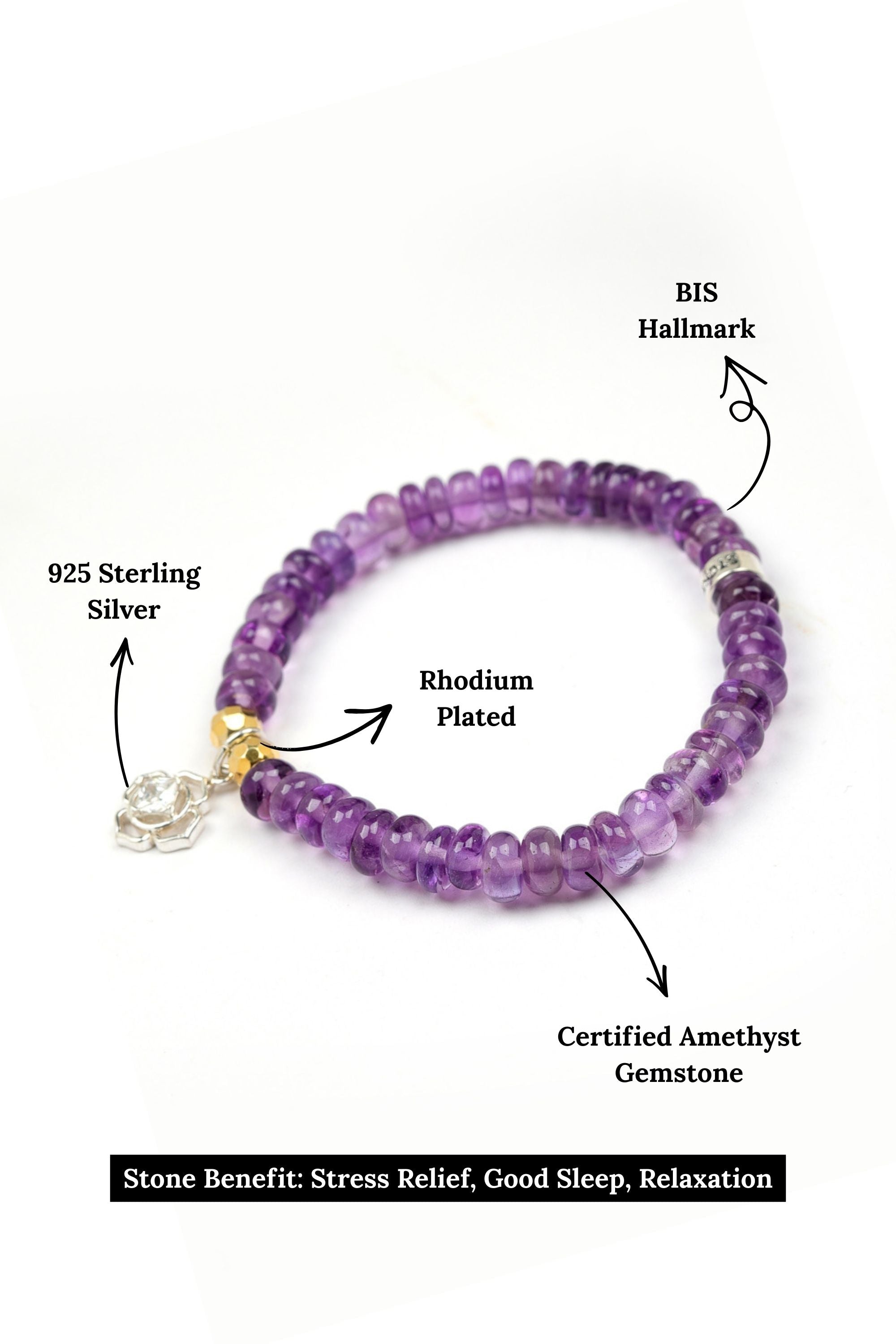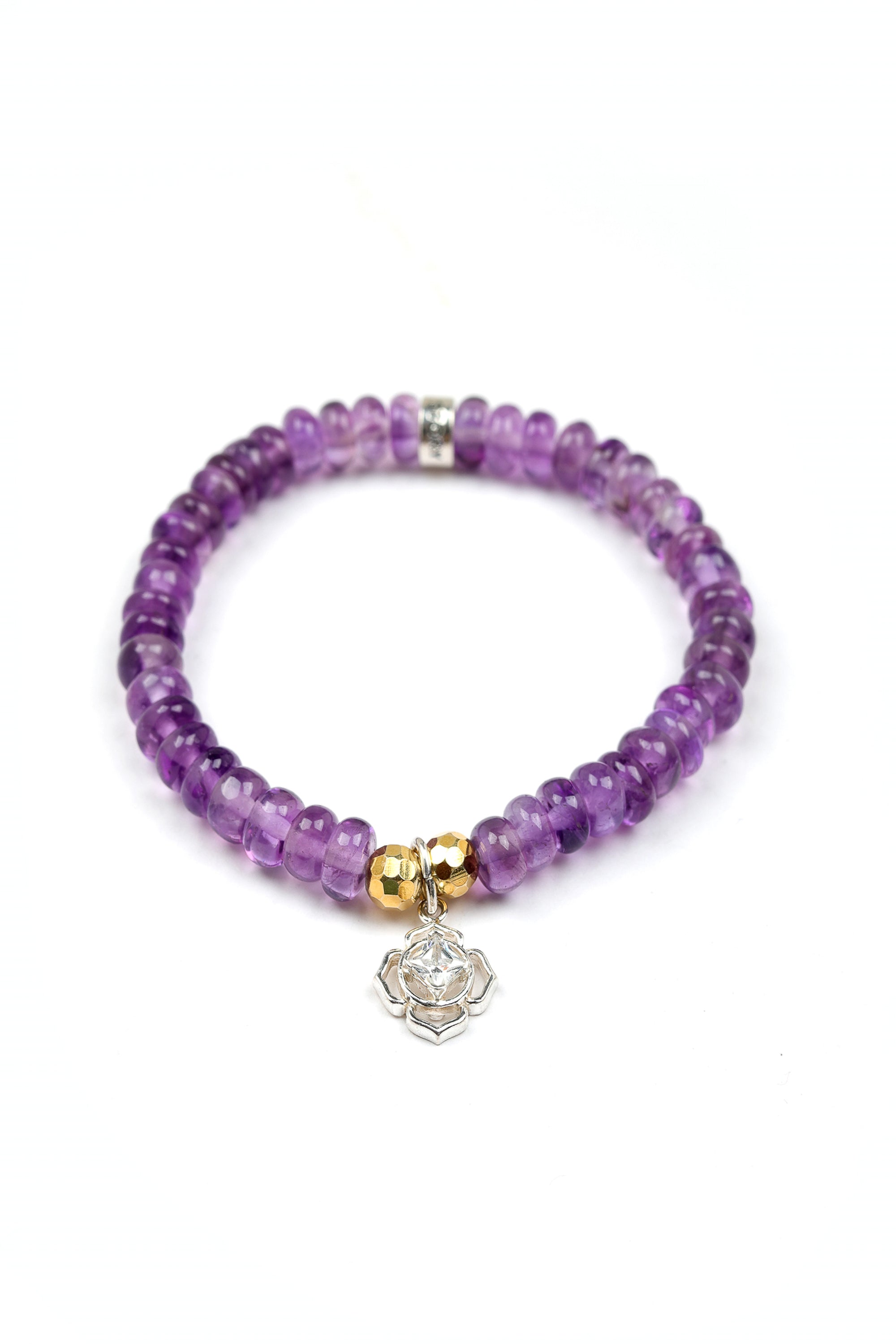 This bracelet features rondelle Amethyst gemstones, an floral charm with a sparkling center, and our signature logo bead, all crafted in 925 Sterling Silver. It seamlessly blends sophistication with everyday wear. Strung on a durable stretch cord, this bracelet is perfect for stacking or wearing solo as a timeless accessory.