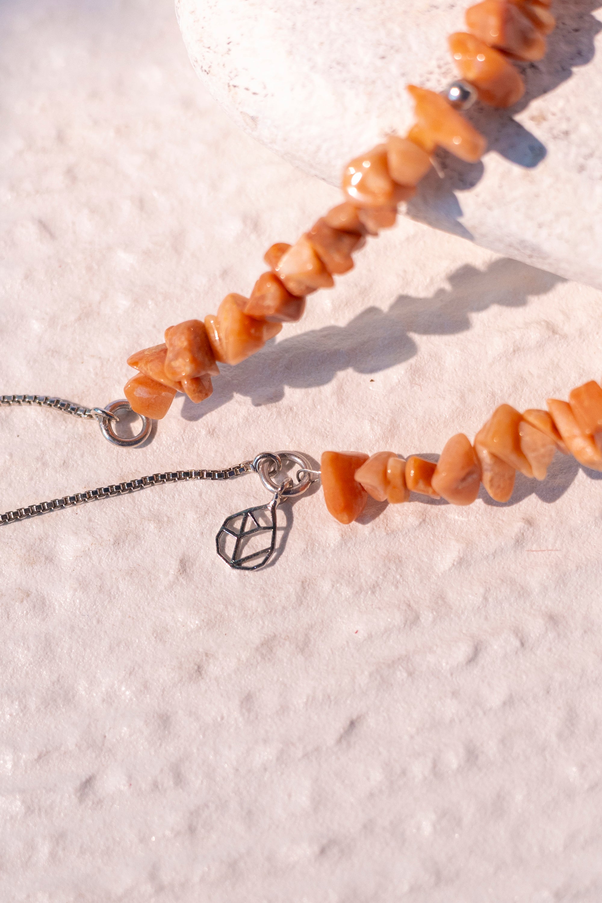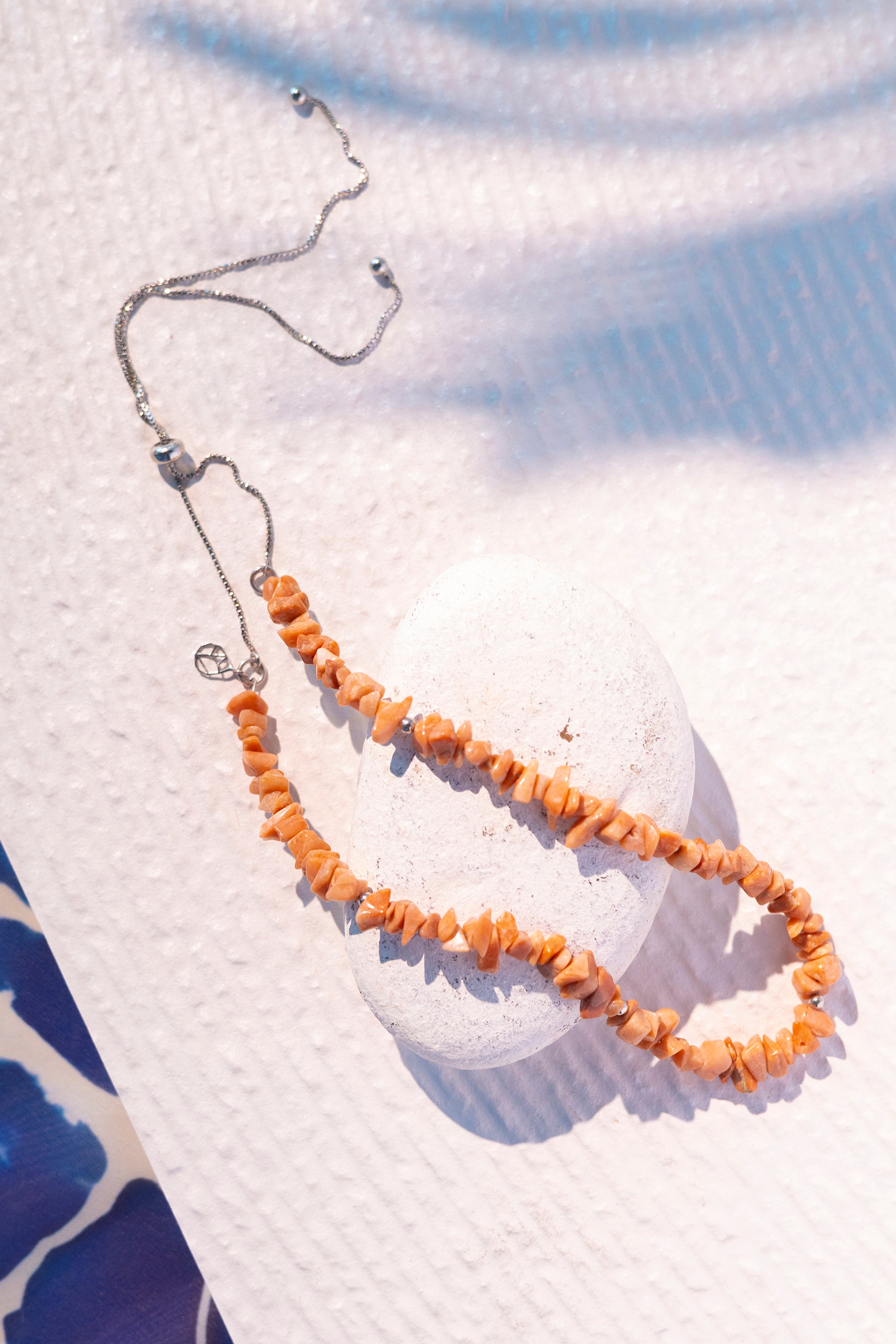 Add a soft and feminine touch to your ensemble with our Peach Moonstone bolo-style necklace, crafted with genuine Peach Moonstone chips set in sterling silver with durable rhodium plating for lasting brilliance. The adjustable length and versatile design make it perfect for layering and complementing any neckline or outfit, whether worn at the front or back. With its ethereal glow and subtle hues, this necklace exudes understated elegance and timeless allure, enhancing your look with a touch of delicate beauty and grace.