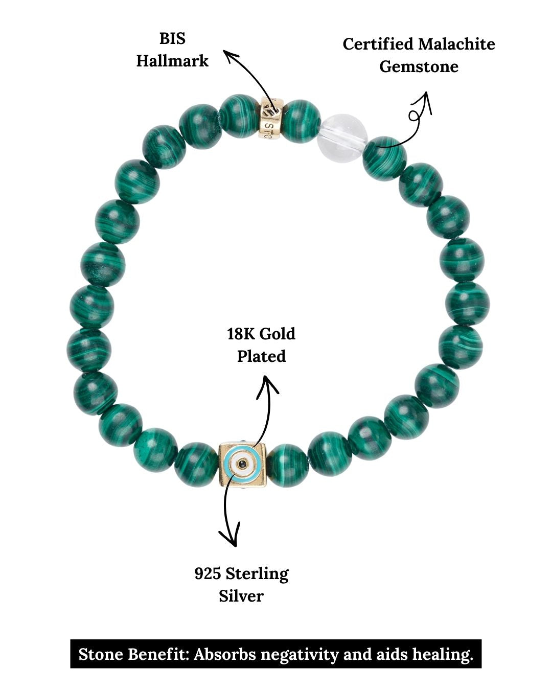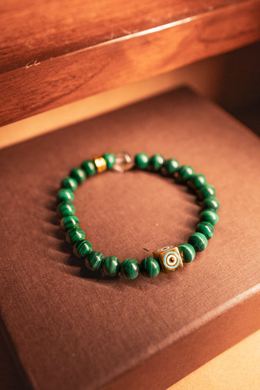 This bracelet features Malachite gemstones, an engraved Evil Eye charm at the center, symbolizing protection and good fortune, and our signature logo bead, all crafted in 925 Sterling Silver. Strung on a durable stretch cord, this bracelet seamlessly blends sophistication with everyday wear, making it perfect for stacking or wearing solo as a timeless accessory.