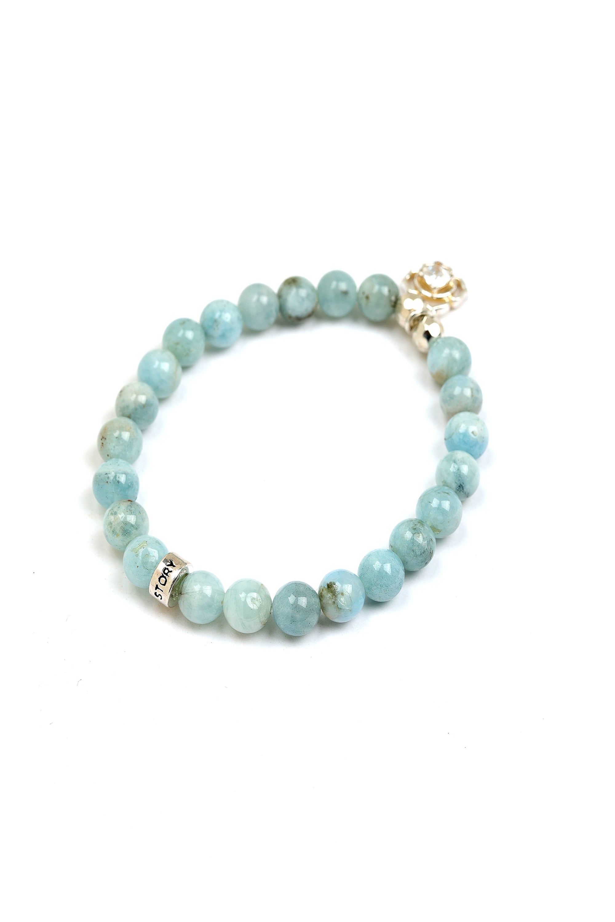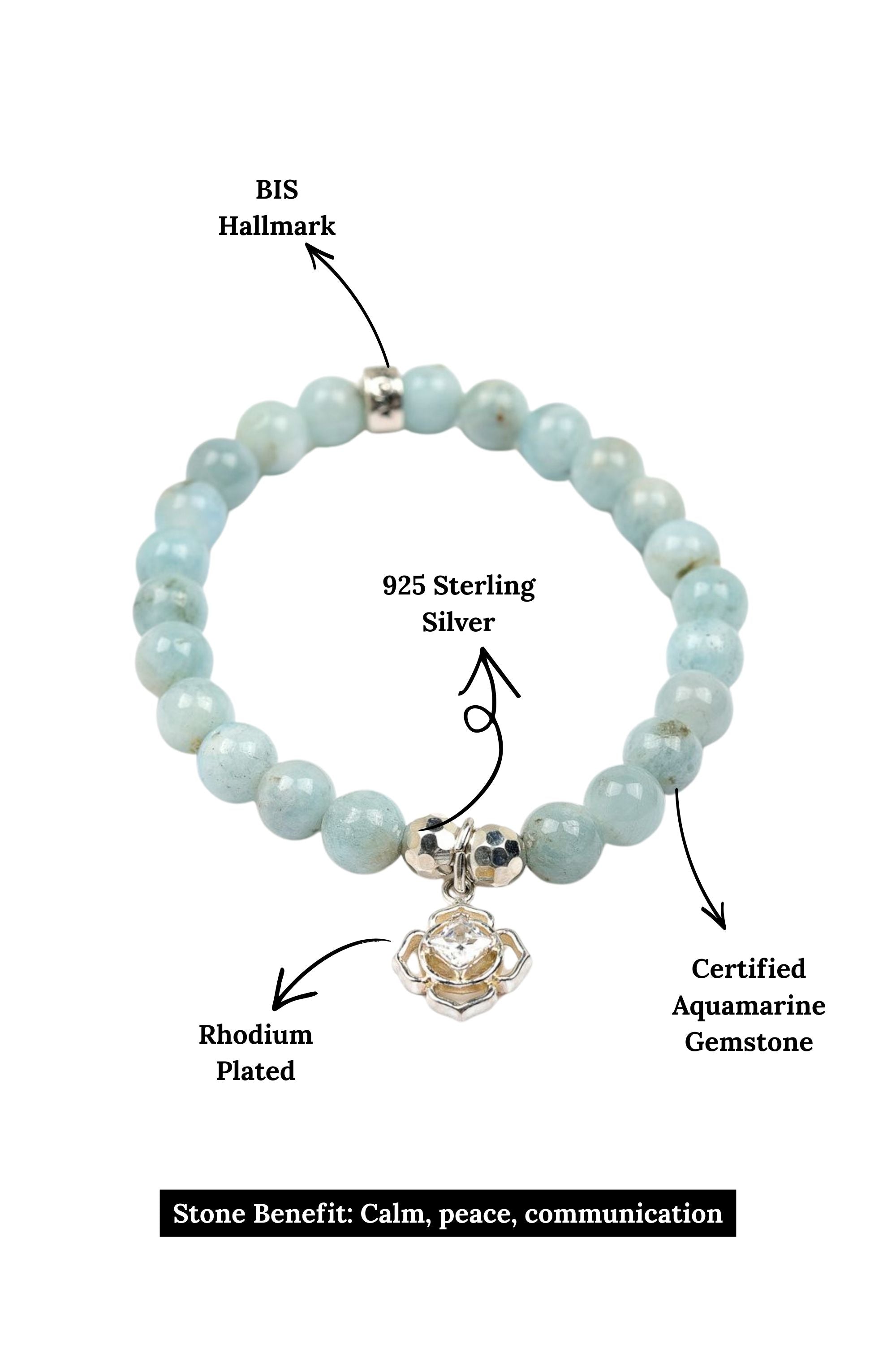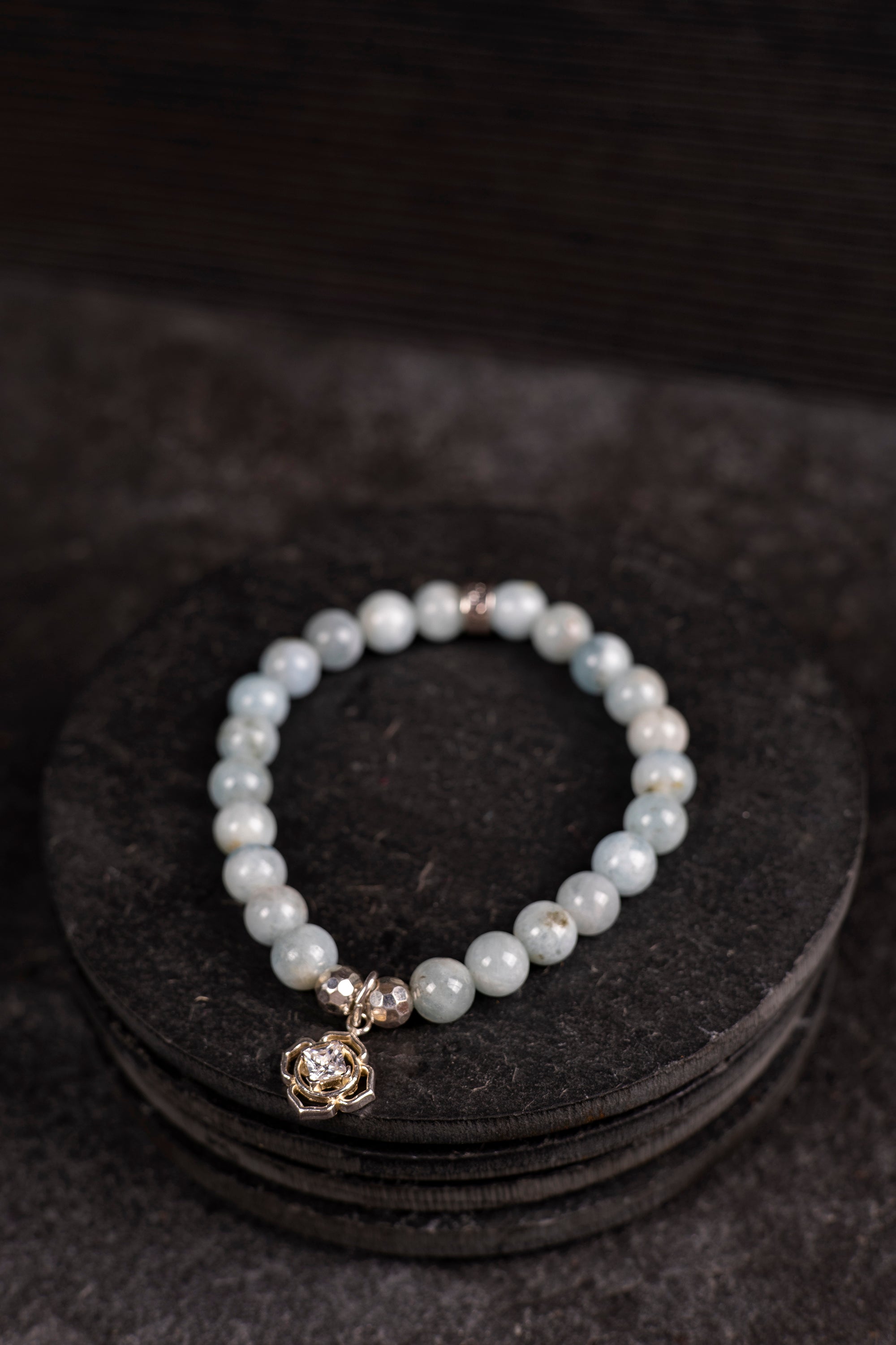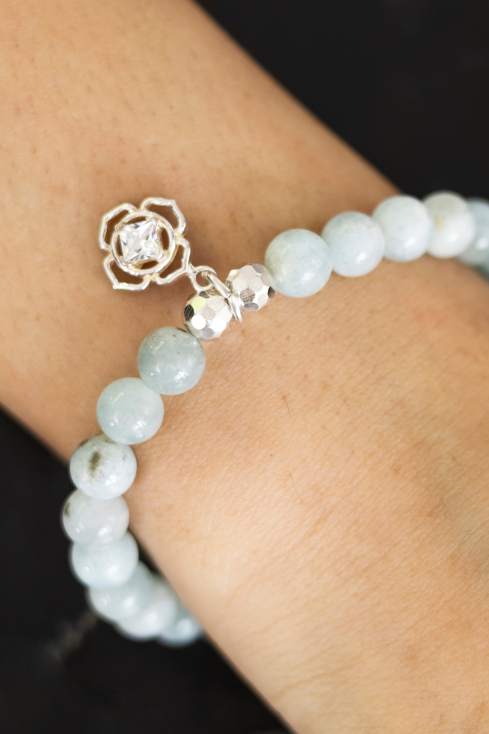 This bracelet features Aquamarine gemstones, a floral charm with a sparkling center, and our signature logo bead, all crafted in 925 Sterling Silver. It seamlessly blends sophistication with everyday wear. Strung on a durable stretch cord, this bracelet is perfect for stacking or wearing solo as a timeless accessory.