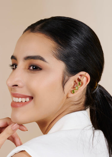 Crafted in sterling silver with 18k gold plating/Rhodium, this sleek ear cuff features striking oval-cut Peridot stones and CZ accents. Its bold, sculptural design follows the ear’s curve, finished with a pointed tip for an edgy touch.