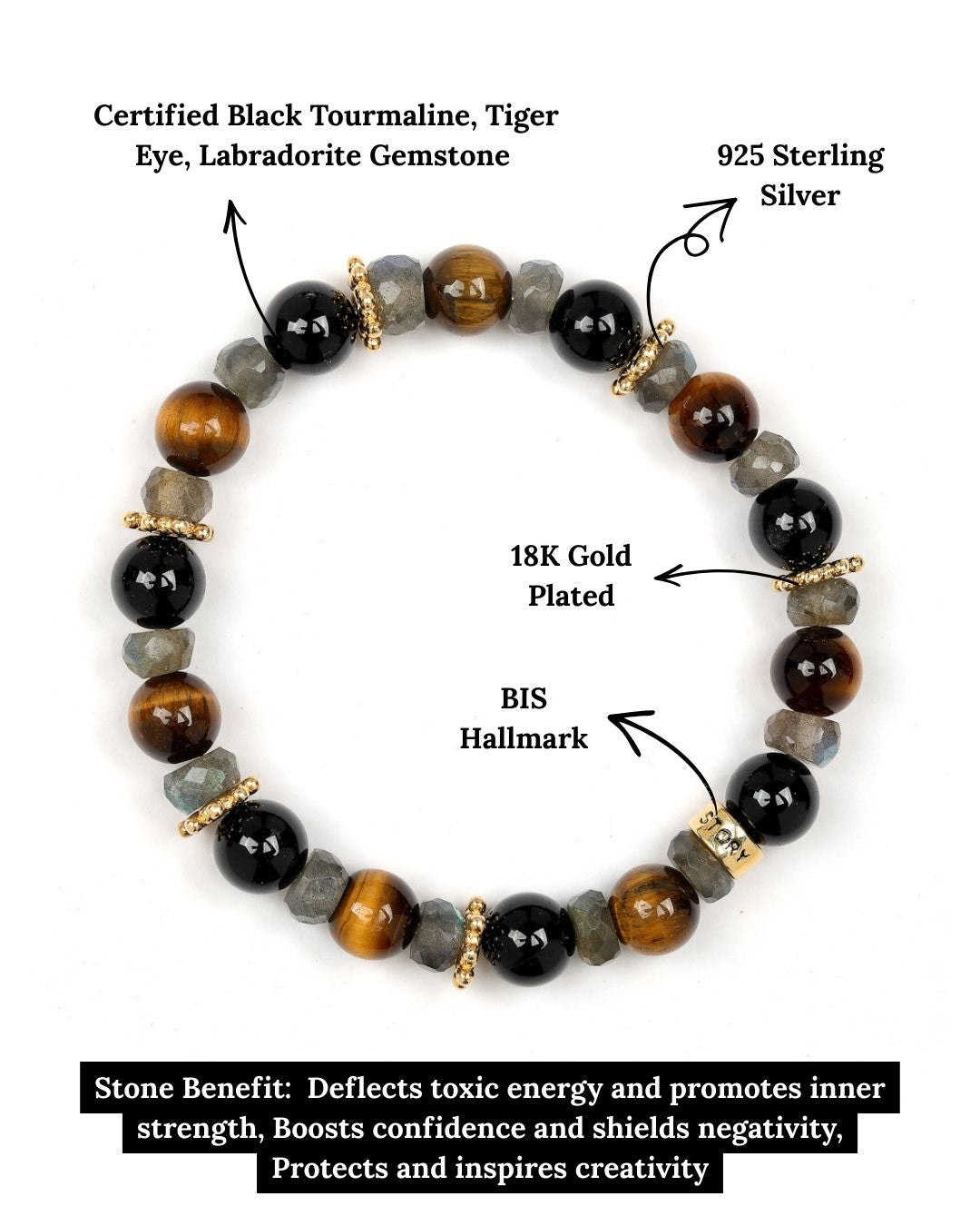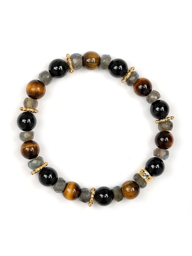 This multi-stone bracelet features Black Tourmaline, Tiger Eye, and Labradorite beads, perfectly combined for a bold and elegant look. Accentuated with sterling silver details and our signature Stone Story logo bead, it symbolizes protection, grounding, and strength, offering support for shielding against negativity and promoting resilience.