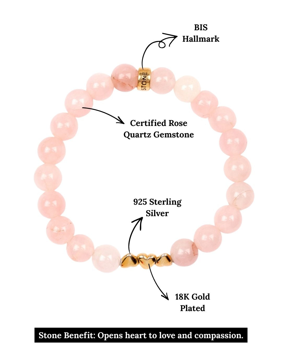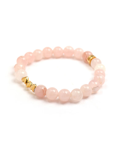A symbol of love and compassion, this Rose Quartz bracelet features soft pink hues, accented with heart charms and our signature logo bead, all crafted in 925 Sterling Silver and 18k gold plated for lasting shine. Perfect for stacking or solo, ideal for everyday wear or a meaningful gift.