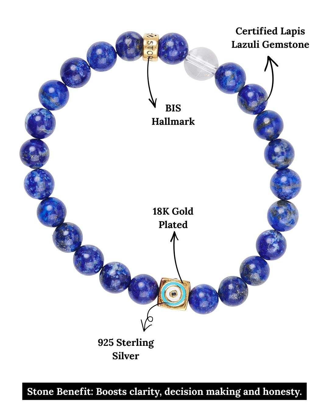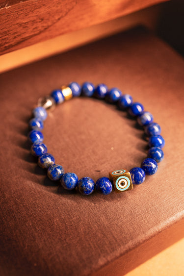 This bracelet features Lapis Lazuli gemstones, an engraved Evil Eye charm at the center, symbolizing protection and good fortune, and our signature logo bead, all crafted in 925 Sterling Silver. Strung on a durable stretch cord, this bracelet seamlessly blends sophistication with everyday wear, making it perfect for stacking or wearing solo as a timeless accessory.