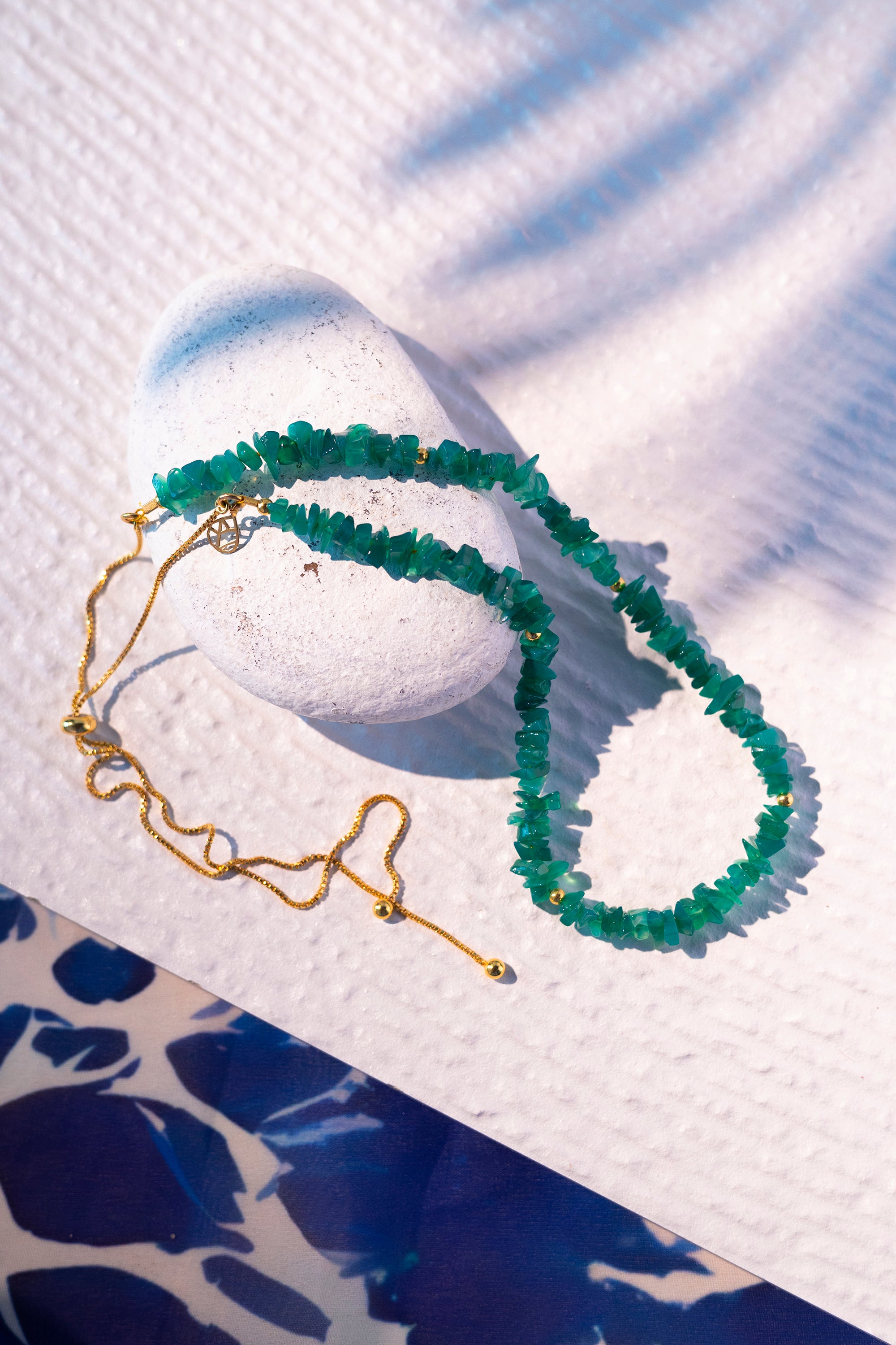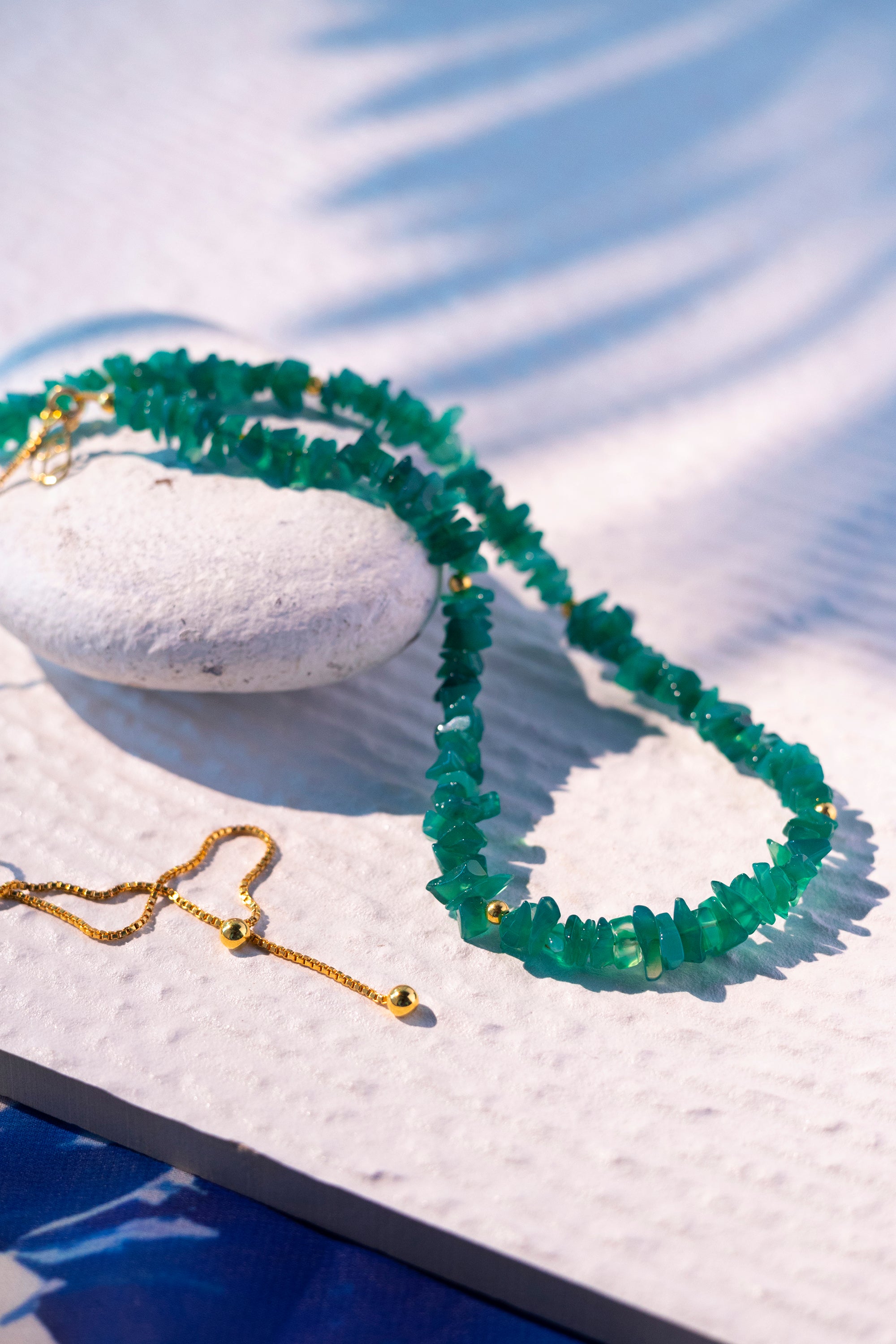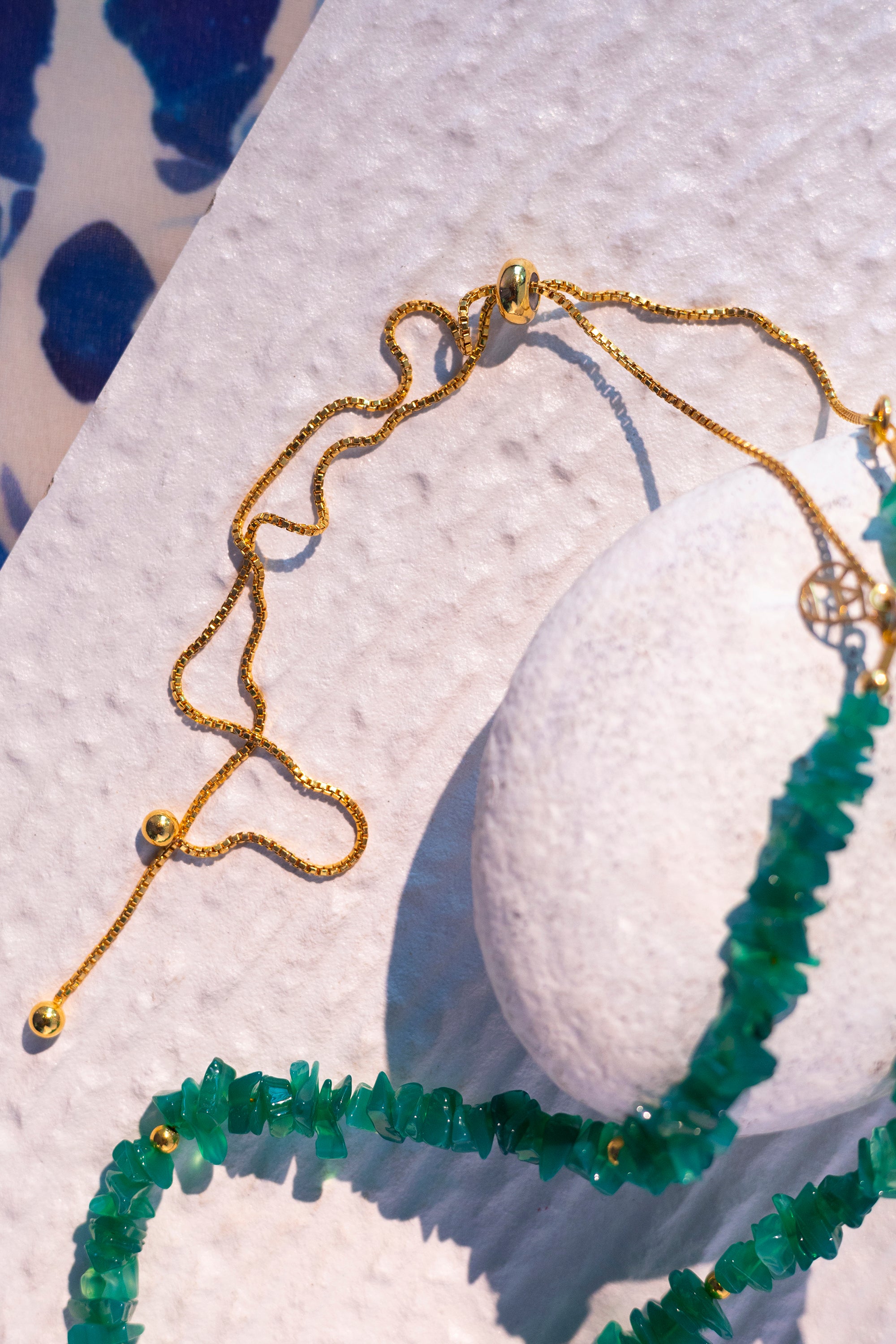 Elevate your style with our stunning bolo-style necklace, featuring genuine Green Onyx stone chips set in STERLING SILVER with durable 18K Gold plating for lasting brilliance and luxury. The innovative sliding clasp mechanism ensures adjustable length, offering versatility to complement any neckline and outfit. Perfect for layering and elevating your ensemble, whether worn at the front or back, this necklace adds a vibrant pop of verdant green, infusing your look with natural elegance and refreshing energy.