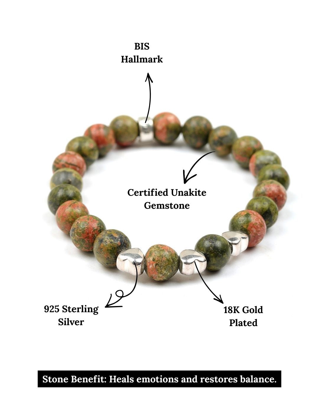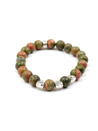 A symbol of harmony and renewal, this Unakite bracelet features earthy green and pink hues, accented with heart charms and our signature logo bead, all crafted in 925 Sterling Silver and rhodium plated for lasting shine. Perfect for stacking or solo, ideal for everyday wear or a meaningful gift.
