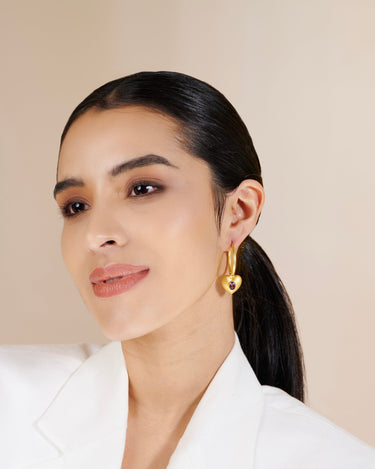 Bold yet subtle, these hoop earrings effortlessly elevate your look. Featuring a central Amethyst stone, these heart-shaped hoops are crafted in 925 Sterling Silver with matte 18K gold plating and rhodium plating. Perfect for any occasion, they combine minimalist elegance with a striking statement. The detachable design lets you transform the earrings into a charm or necklace, offering versatile styling options.