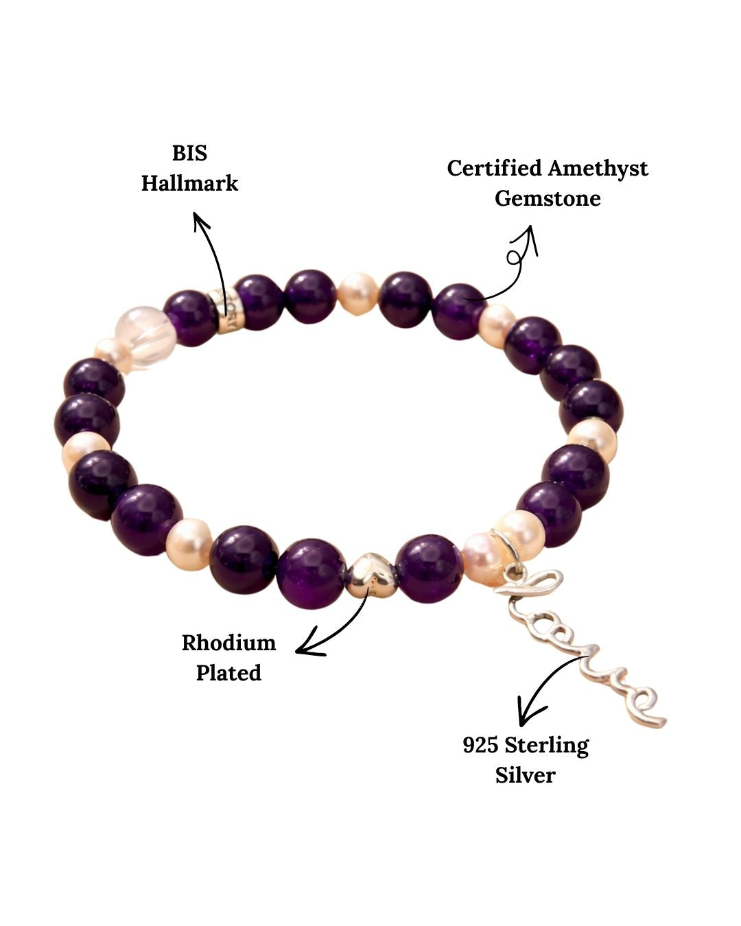 A graceful blend of emotion and elegance, this bracelet features soothing Amethyst, luminous fresh water Pearls, and a single Clear Quartz bead to amplify your intentions. The CZ-studded Love charm and our signature logo bead add a personal touch, all strung on a comfortable stretch band.