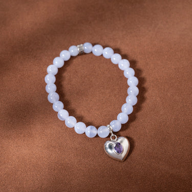 This bracelet features the serene beauty of Blue Lace Agate gemstones, known for their calming energy and gentle encouragement of honest expression. At its center is a heart-shaped charm set with Amethyst—symbolising emotional clarity and inner balance—paired with our signature logo bead, both crafted in 925 Sterling Silver and finished with a sleek rhodium plating. Strung on a durable stretch cord, it’s an effortless blend of elegance and intention—perfect for daily wear, stacking, or standing strong on its own.