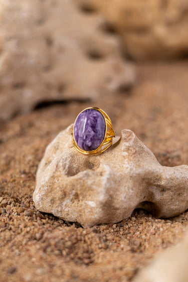Crafted in 925 sterling silver with a refined bezel setting, this ring features an oval cabochon Charoite—a rare stone admired for its swirling violet hues and natural depth. Available in rhodium and 18K gold plating, it blends modern sophistication with timeless charm. Designed with an adjustable band for a perfect fit, it’s an elegant statement piece that adds effortless refinement to any look.