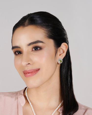 Bold yet subtle, the earring studs are designed to effortlessly elevate your look. Featuring a central PERIDOT stone and an art-deco inspired edge detailing, these studs are crafted in 925 Sterling Silver and is available in rhodium plating. Perfect for any occasion, they combine minimalist elegance with a striking statement.