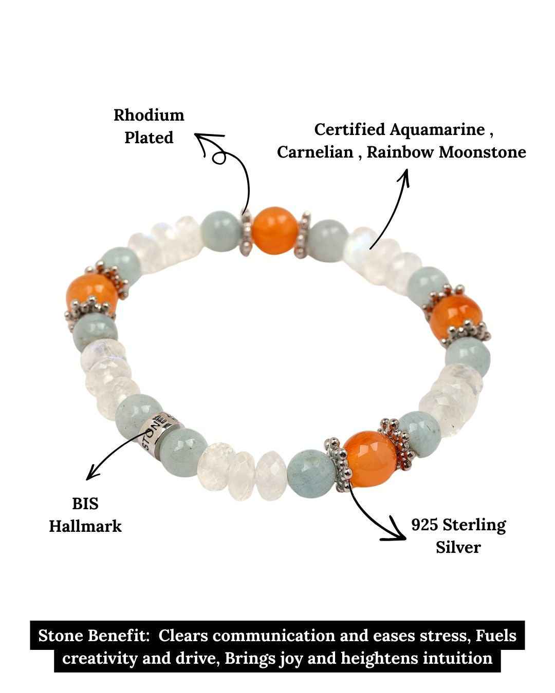 This multi-stone bracelet features Carnelian, Rainbow Moonstone, and Aquamarine beads, perfectly combined for a delicate and elegant look. Accentuated with sterling silver details and our signature Stone Story logo bead, it symbolizes vitality, balance, and calm, offering support for fertility and emotional wellness.