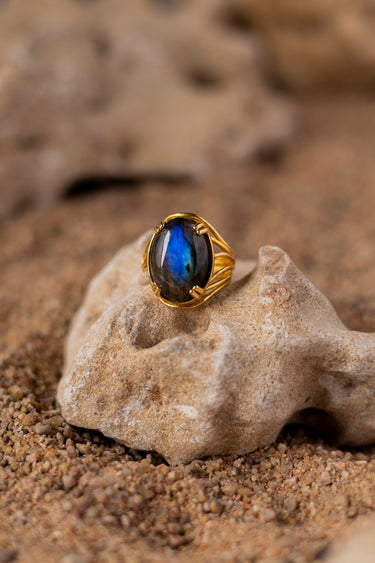 Crafted in 925 sterling silver with an elegant prong setting, this ring features an oval cabochon Labradorite that shimmers with iridescent flashes of blue and green. Available in Rhodium and 18K Gold, it combines modern design with timeless allure. Designed with an adjustable band for a perfect fit, it’s a refined statement piece that captures light—and attention—with every movement.