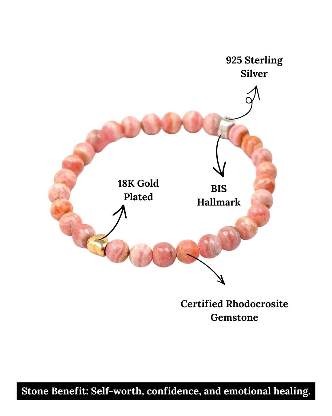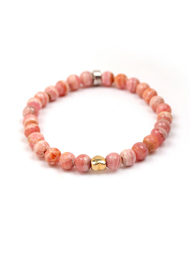 A symbol of joy and emotional healing, this Rhodochrosite bracelet features rich pink hues with natural patterns, accented with heart charms and our signature logo bead, all crafted in 925 Sterling Silver and 18k gold plated for lasting shine. Perfect for stacking or solo, ideal for everyday wear or a meaningful gift.