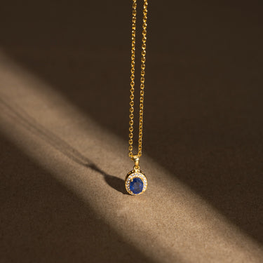 Elevate your look with this Blue Sapphire birthstone pendant necklace. The deep blue oval Blue Sapphire takes center stage, elegantly set in a classic prong design that highlights its captivating depth. Encircled by a halo of shimmering CZ stones, this pendant radiates a subtle sparkle with every movement. Whether worn alone or layered with your favorite pieces, this necklace effortlessly blends timeless sophistication with modern allure, making it the perfect accessory for any occasion.