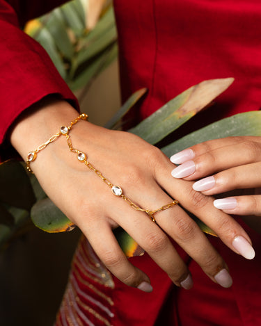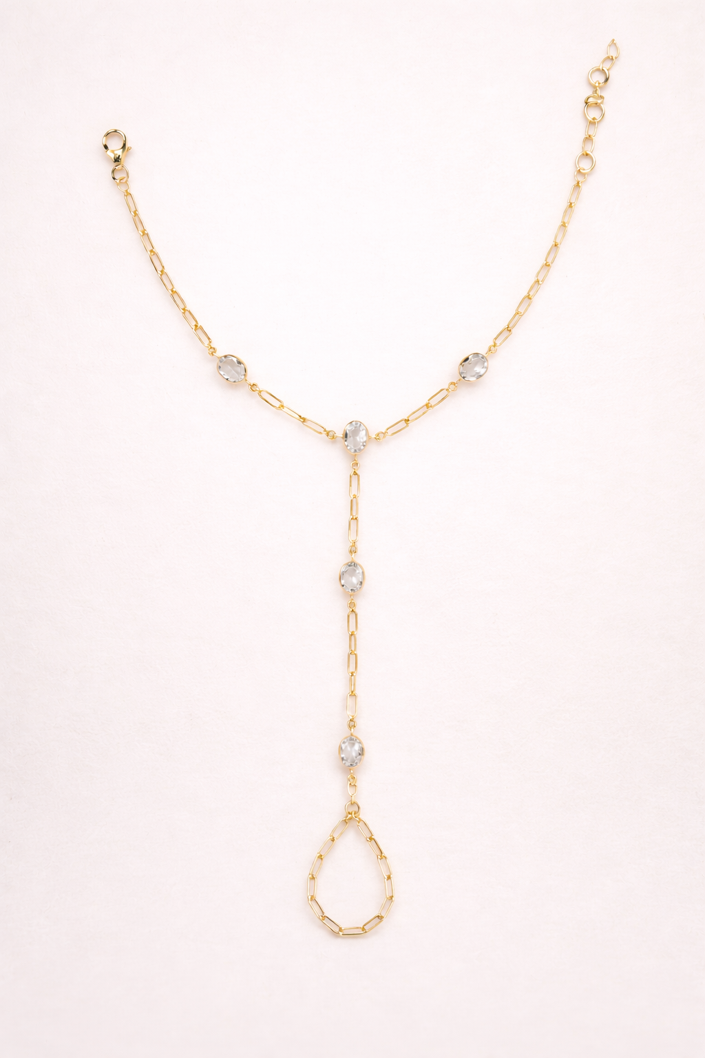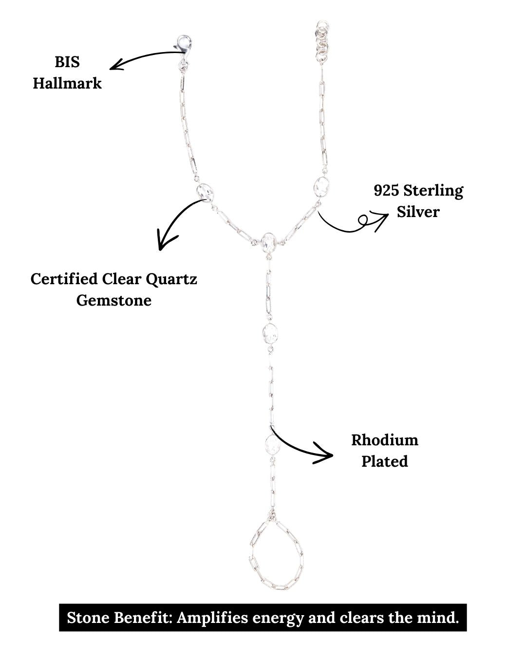 Crafted in sterling silver and rhodium plated, this hand chain bracelet strikes the perfect balance between minimal design and a statement look. Featuring Clear Quartz gemstones, it brings a touch of elegance to any outfit. The delicate chain seamlessly connects the bracelet to a dainty ring, creating a fluid and graceful silhouette. Lightweight yet eye-catching, this piece is perfect for those who love understated elegance with a bold edge.