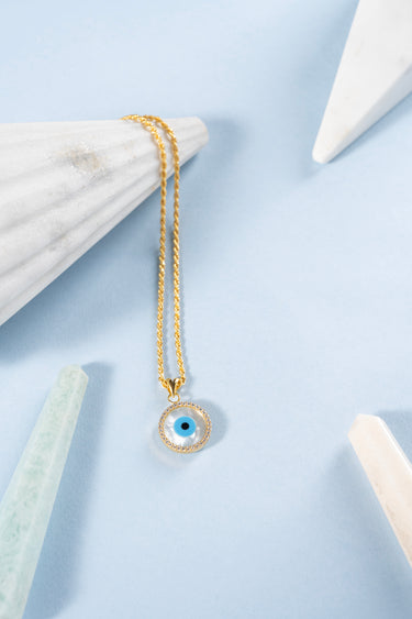 This elegant necklace features a round pendant designed as a captivating evil eye. At its center is a vibrant turquoise stone, encircled by a smooth ring of mother-of-pearl, creating a striking contrast. A small black tourmaline stone forms the eye's pupil, adding depth to the design. The outer edge is adorned with a halo of shimmering cubic zirconia, offering a touch of brilliance. Suspended on a delicate chain, this piece effortlessly combines timeless elegance with a modern touch, making it a versatile accessory for any occasion.