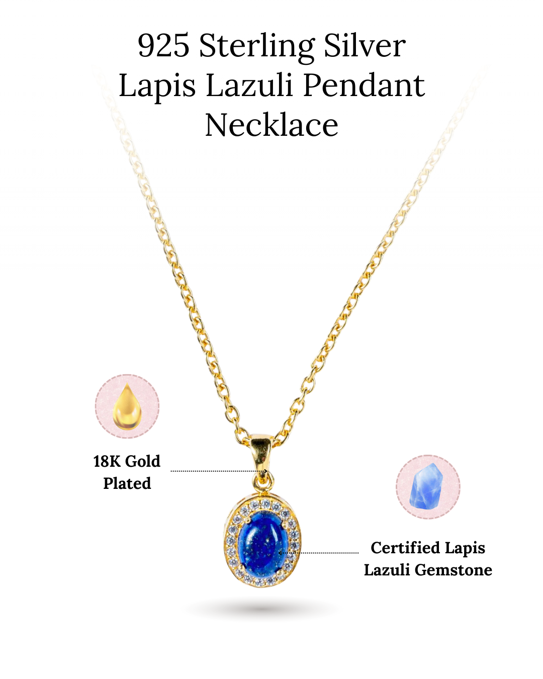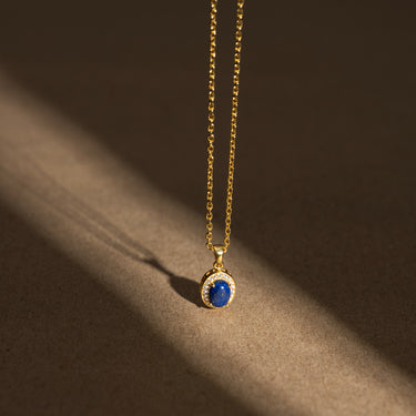 Elevate your look with this Lapis Lazuli birthstone pendant necklace. The rich blue oval Lapis Lazuli takes center stage, elegantly set in a classic prong design that enhances its deep, celestial hue. Encircled by a halo of shimmering CZ stones, this pendant radiates a subtle sparkle with every movement. Whether worn alone or layered with your favorite pieces, this necklace effortlessly blends timeless sophistication with modern allure, making it the perfect accessory for any occasion.