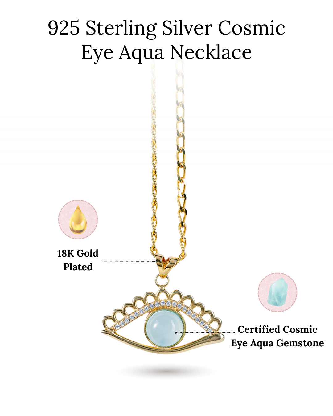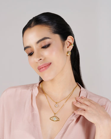 This stunning necklace features a bold Eye design crafted in Sterling Silver and plated with 18K Gold. The pendant showcases a smooth Blue Chalcedony cabochon stone at its center, surrounded by intricate eyelash-inspired details encrusted with shimmering cubic zirconia (CZ) stones for added brilliance.The pendant hangs gracefully from a sleek, 18k gold-plated curb chain ,combining elegance with a contemporary edge. Perfect for elevating any outfit, this piece is a seamless blend of craftsmanship and style.