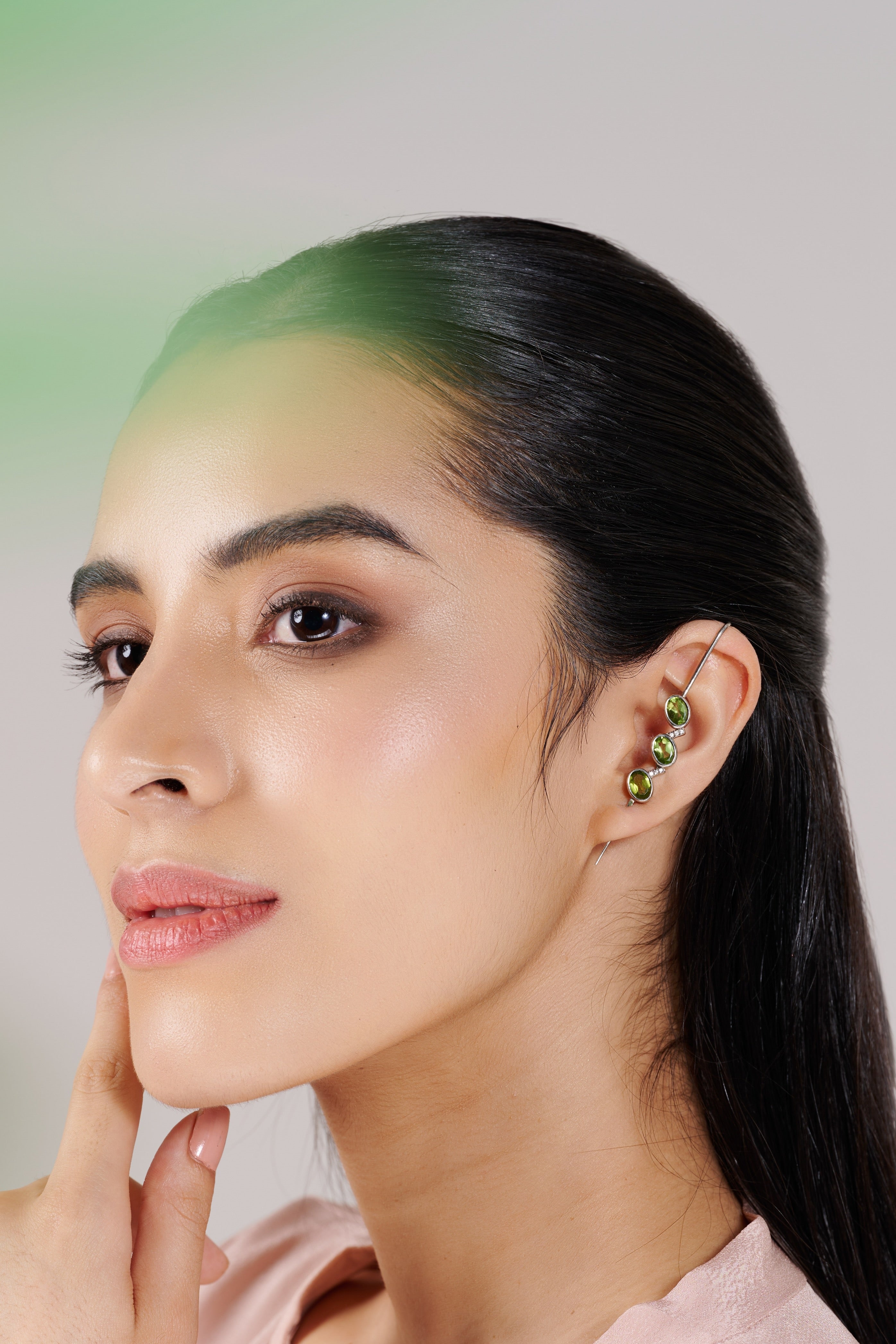 Crafted in sterling silver with 18k gold plating/Rhodium, this sleek ear cuff features striking oval-cut Peridot stones and CZ accents. Its bold, sculptural design follows the ear’s curve, finished with a pointed tip for an edgy touch.