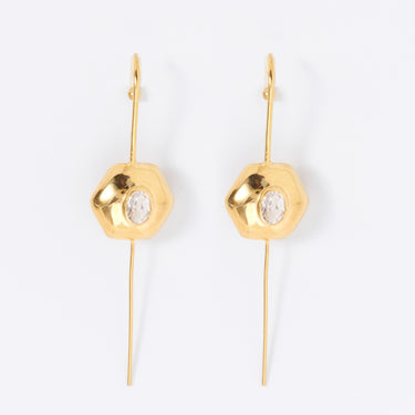 These earrings feature hexagon-inspired gold forms set with clear quartz stones that reflect light with a soft, natural glow. Crafted in 925 sterling silver and plated with 18K gold, they embody quiet sophistication — minimal, fluid, and endlessly versatile.