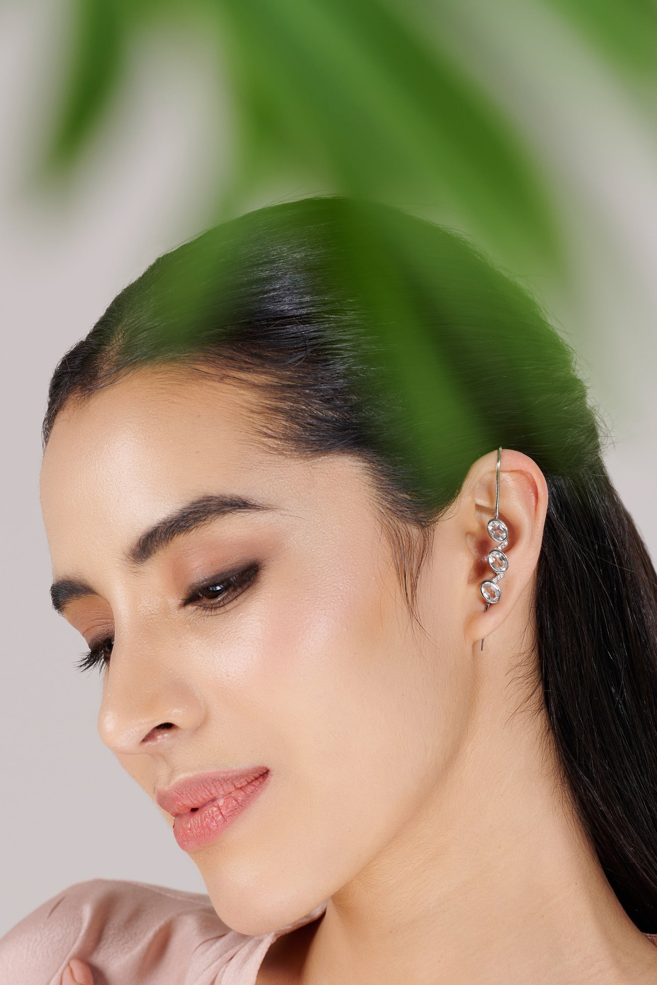 Crafted in sterling silver with 18k gold/Rhodium plating, this sleek ear cuff features striking oval-cut Clear Quartz stones and CZ accents. Its bold, sculptural design follows the ear’s curve, finished with a pointed tip for an edgy touch.