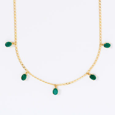 This necklace features fine oval-cut green onyx stone charms suspended along a sleek gold chain. Each stone shimmers with quiet vitality, symbolizing growth and renewal. Crafted in 925 sterling silver with 18K gold plating, it adds a touch of refined elegance to your everyday rhythm — effortless, luminous, and full of life.